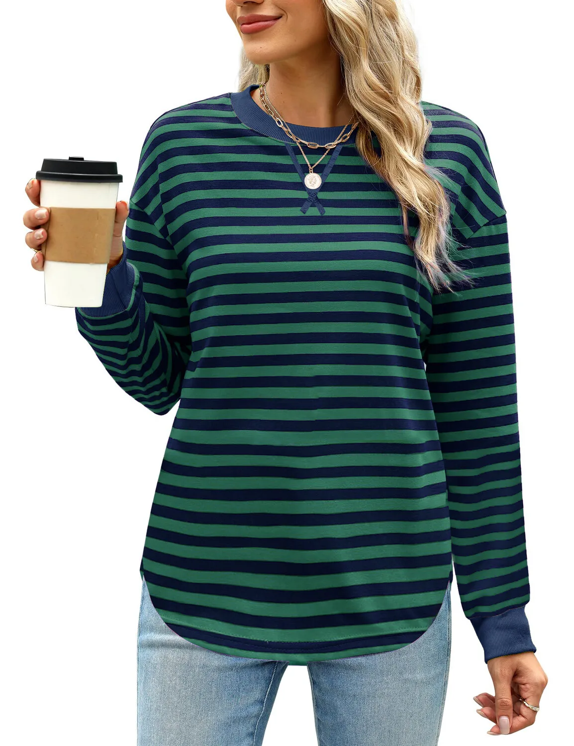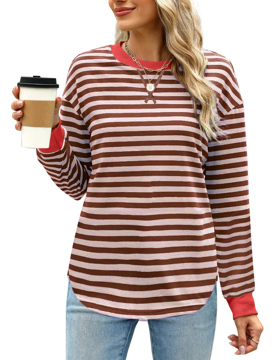 تيشيرت نسائي مخطط بأكمام طويلة وياقة دائرية، بتصميم عصري بألوان متداخلة، مناسب لفصل الخريف 2025، بلوزة كاجوال أنيقة.