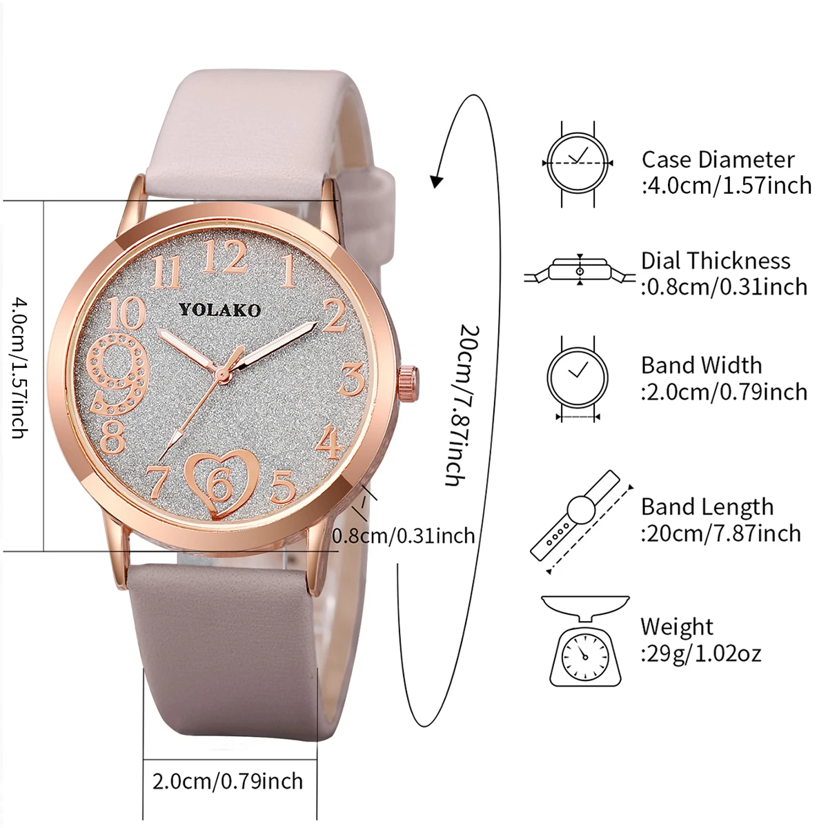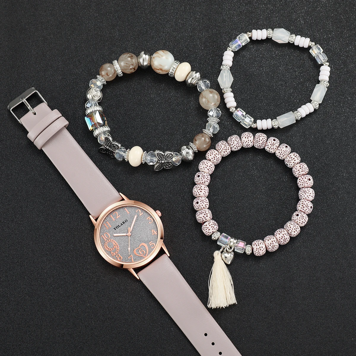 طقم مكون من 4 قطع: ساعة كوارتز نسائية أنيقة بسوار جلدي ومجوهرات على شكل قلب