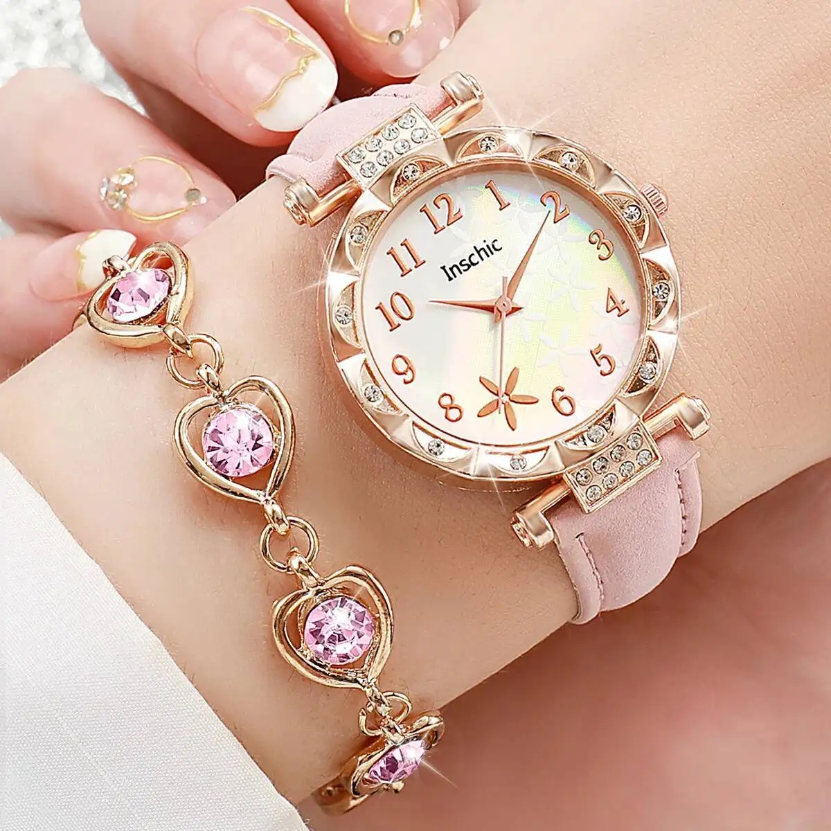 طقم ساعات نسائية كوارتز مزينة بزخارف زهور أنيقة، مكون من 6 قطع، مع سوار جلدي، مرصعة بأحجار الراين (بدون علبة)