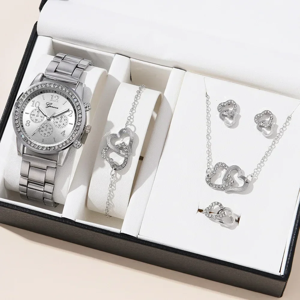 طقم فاخر من 6 قطع باللون الذهبي الوردي، ساعة يد نسائية، خاتم، قلادة، أقراط، ساعة يد مرصعة بأحجار الراين، ساعة يد أنيقة، سوار نسائي كاجوال