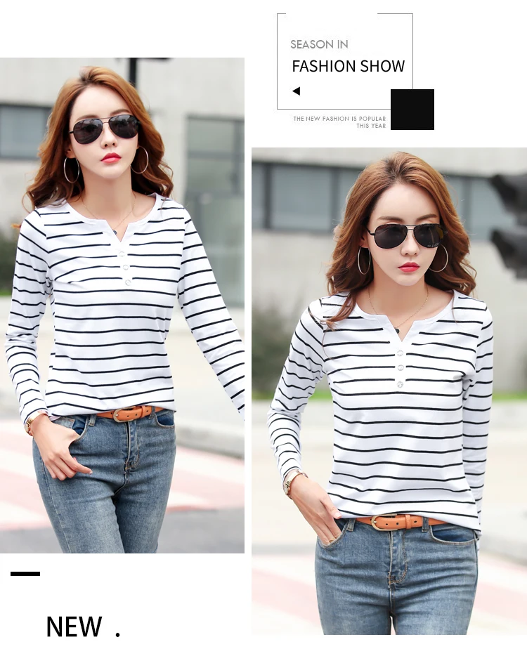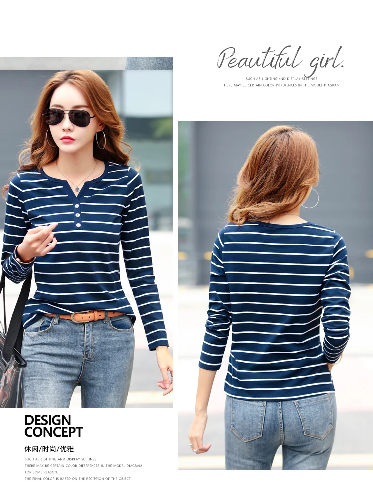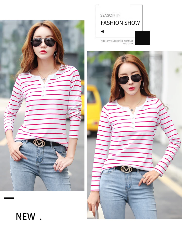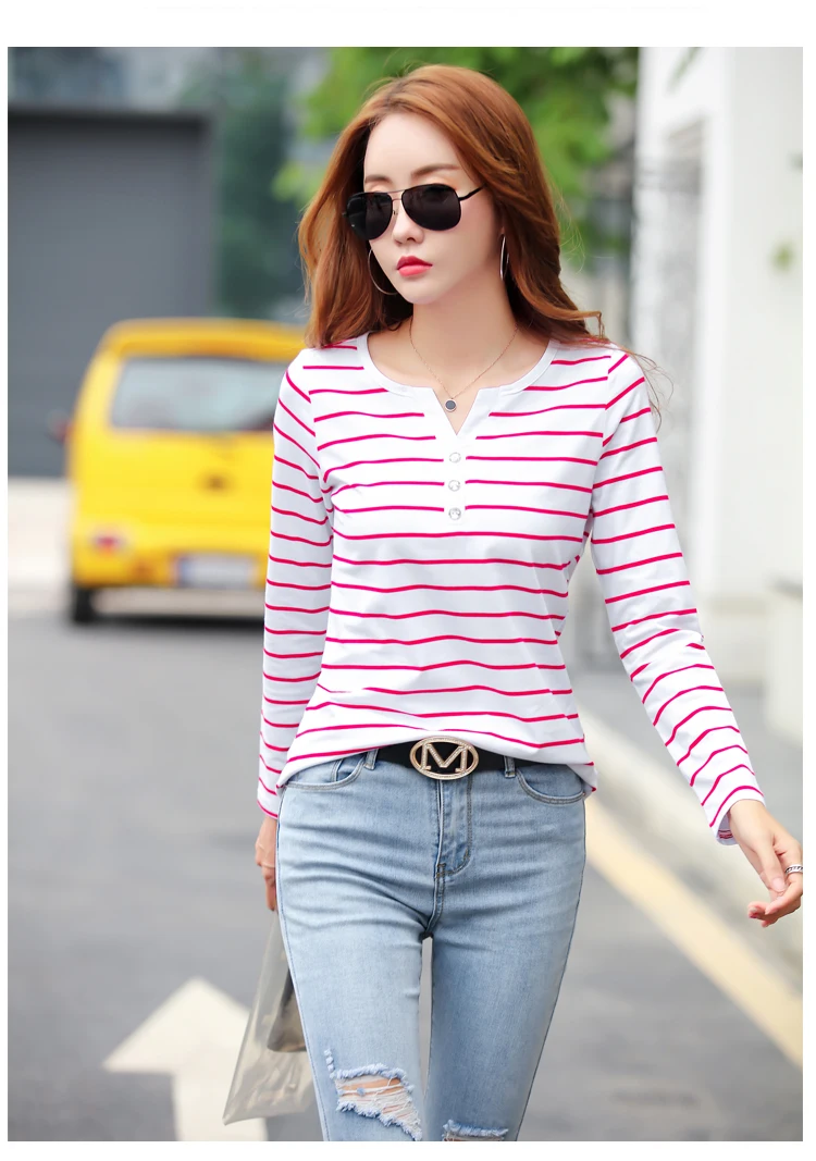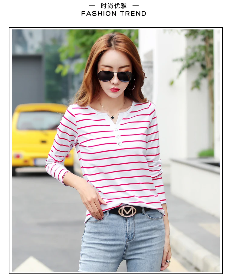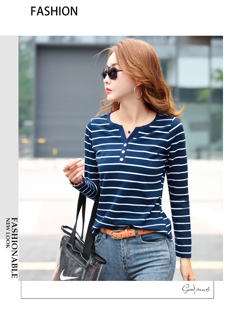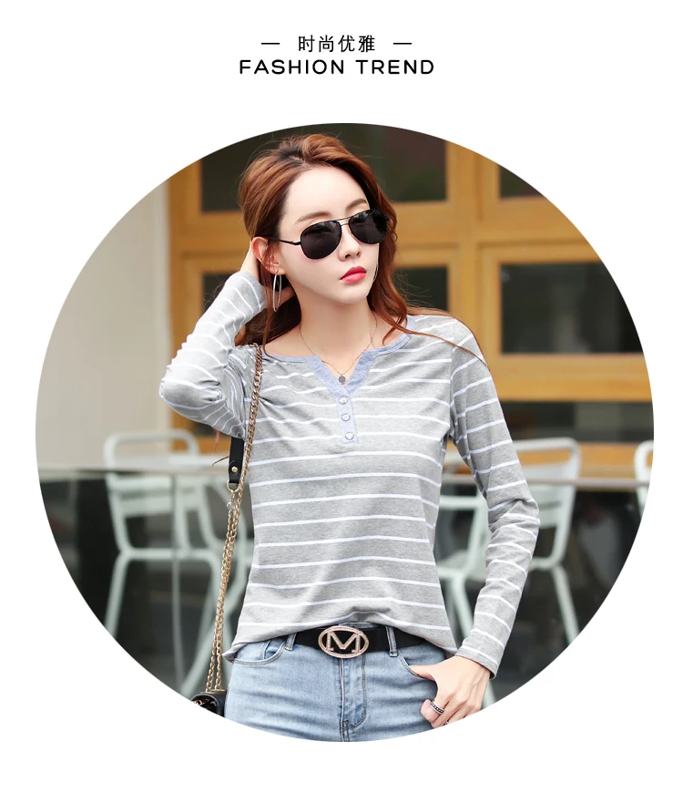 تيشيرت قطني كاجوال للنساء، مناسب لفصل الخريف، ربيع 2023، بأكمام طويلة مخططة، بتصميم عصري، بياقة على شكل حرف V، رقم الموديل 7215 50