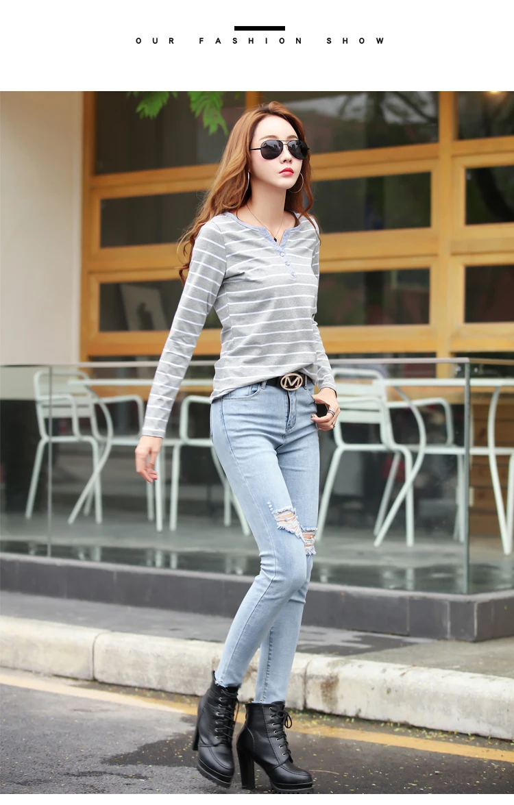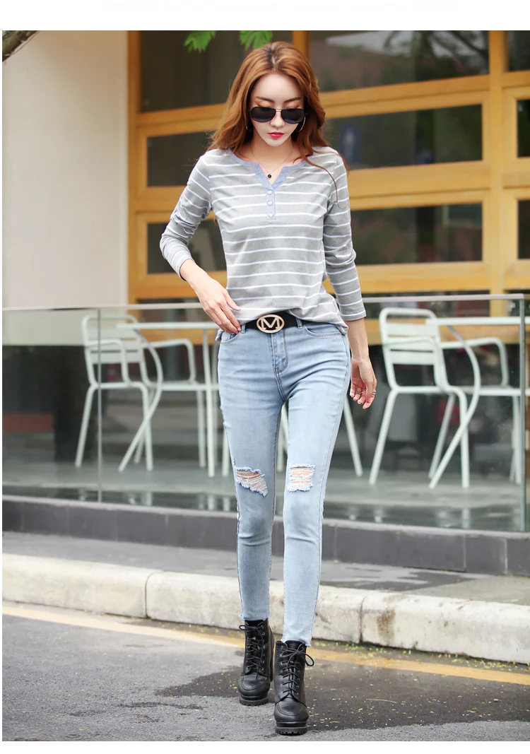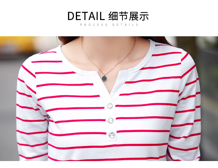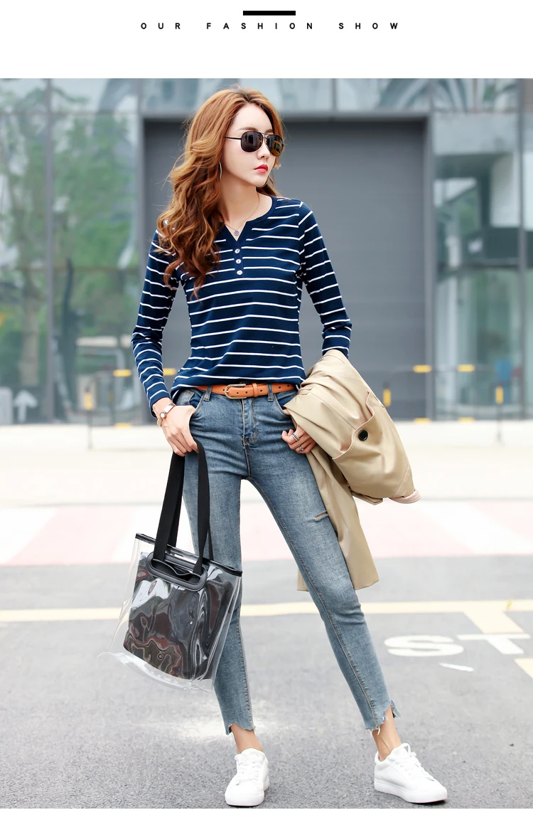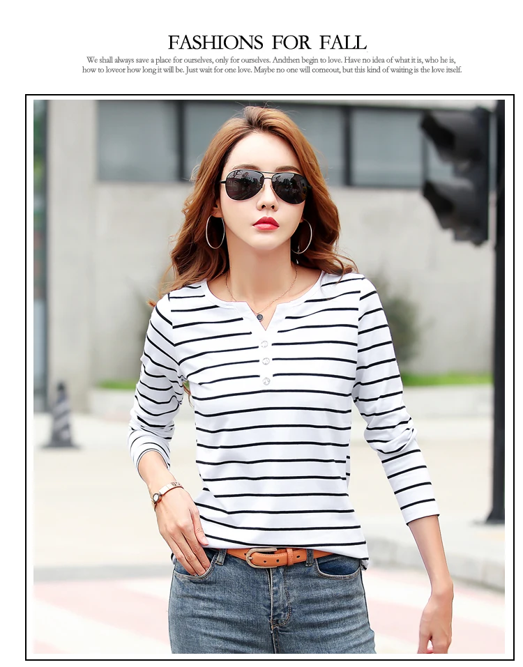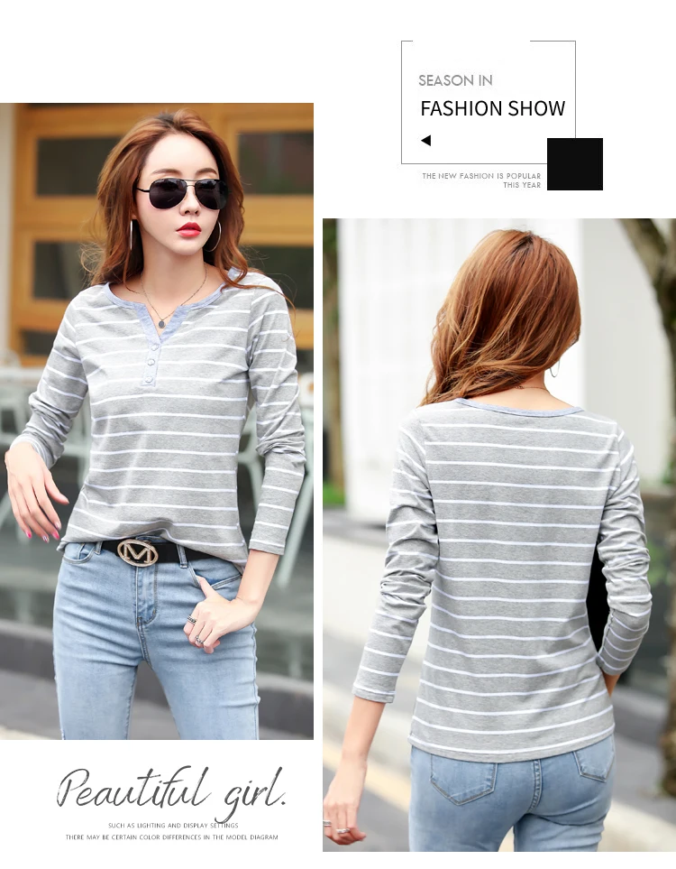 تيشيرت قطني كاجوال للنساء، مناسب لفصل الخريف، ربيع 2023، بأكمام طويلة مخططة، بتصميم عصري، بياقة على شكل حرف V، رقم الموديل 7215 50