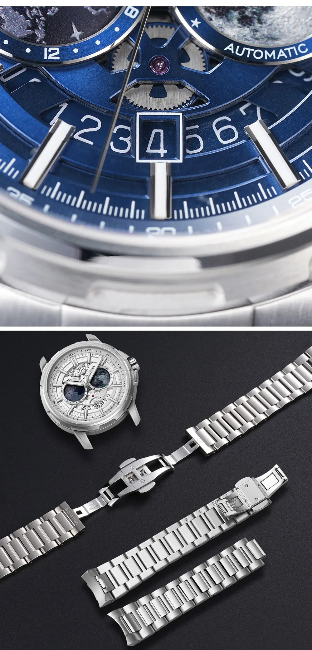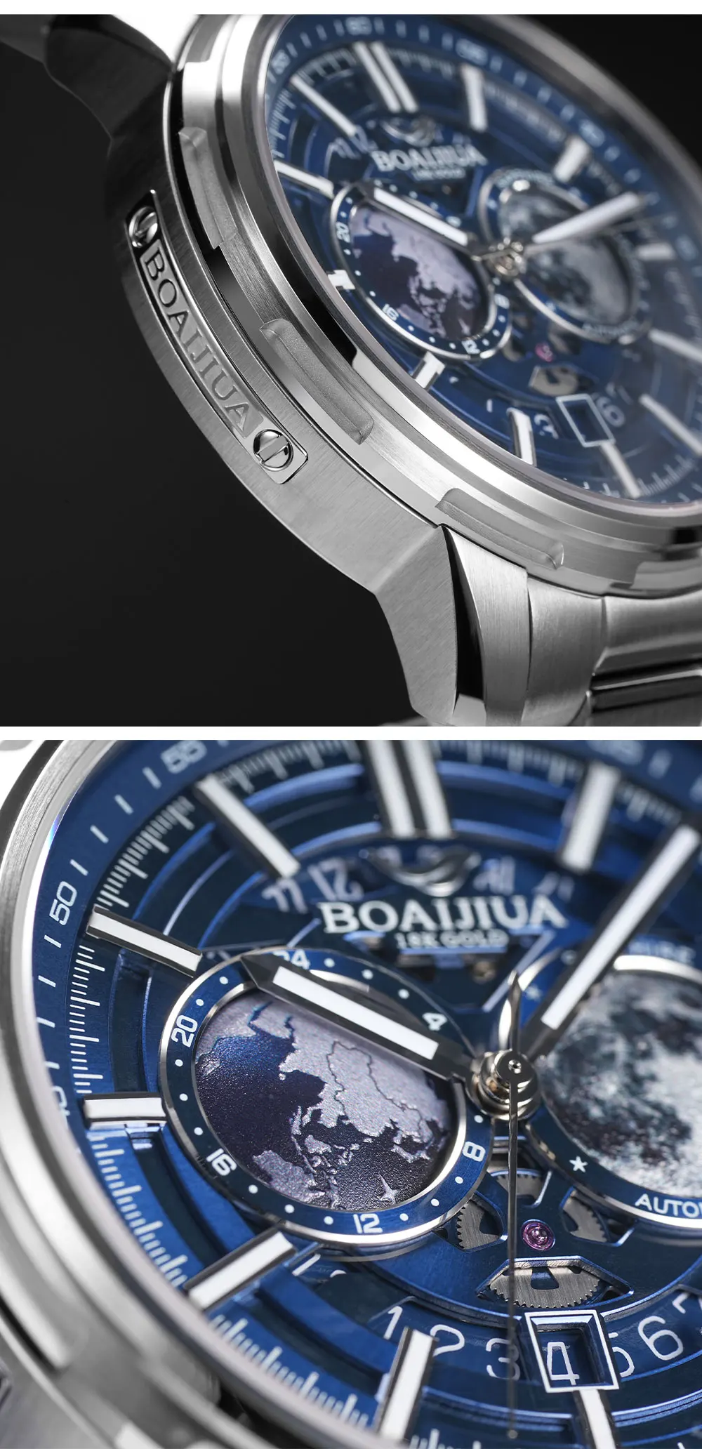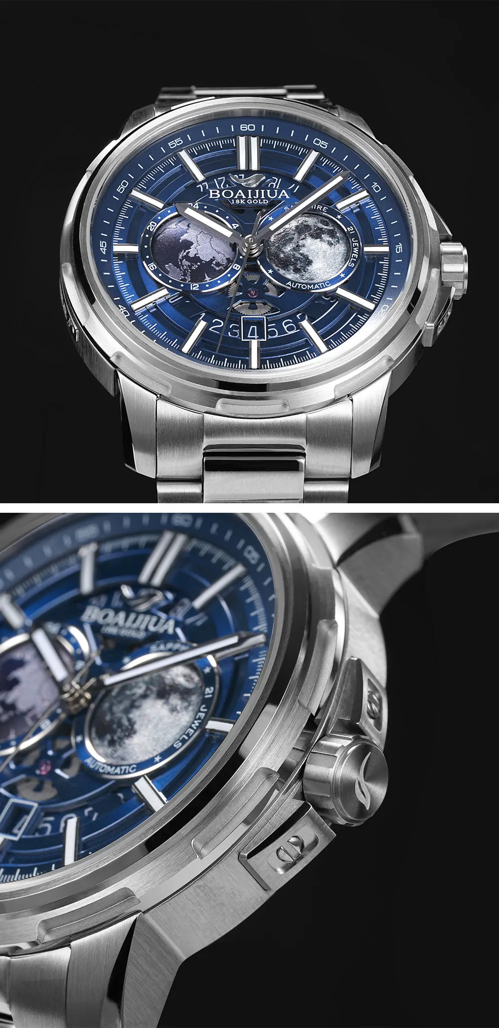 سلسلة بواجيو إكسبلورر B8002G - "مجرة لامعة": عند موضع الساعة التاسعة، يدور قرص أرضي مصغر كل 24 ساعة، بينما يدور القمر برشاقة عند موضع الساعة الثالثة، مجسدًا الرفقة الأبدية لكوكبنا وقمره. علبة ساعة "نهر النجوم اللامعة" مصنوعة من الفولاذ المقاوم للصدأ 316L المقاوم للتآكل، ما يحافظ على بريقها، وتجمع بين الفن الكوني والمتانة العالية. تعمل بحركة ميوتا 8217 الميكانيكية الأوتوماتيكية الموثوقة - لا حاجة لبطارية، مستغلةً حركة معصمك لقوة ثابتة. يتميز ميناء الساعة بشعار مميز من الذهب الأبيض عيار 18 قيراطًا، مما يضفي لمسة من الفخامة الراقية على روايتها السماوية.