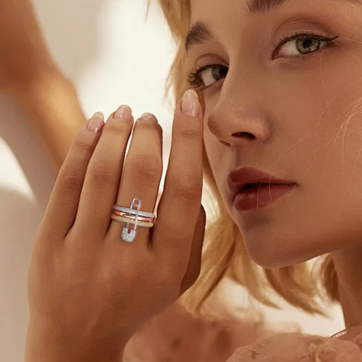 خواتم ثلاثية الطبقات بتصميم دبوس للنساء، مرصعة بالزركونيا المكعبة، قابلة للتكديس، مصنوعة من الفولاذ المقاوم للصدأ، هدية مثالية للعام الجديد ومجوهرات للحفلات.
