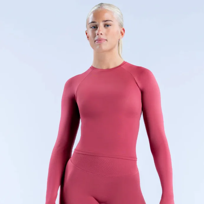 طقم تمرين رياضي نسائي من نسيج محبوك بدون درزات أوروبية سريع الجفاف بأكمام طويلة وبنطلون لرفع الأرداف بقصّة ضيقة لممارسة اليوجا في صالة الألعاب الرياضية واللياقة البدنية والجري