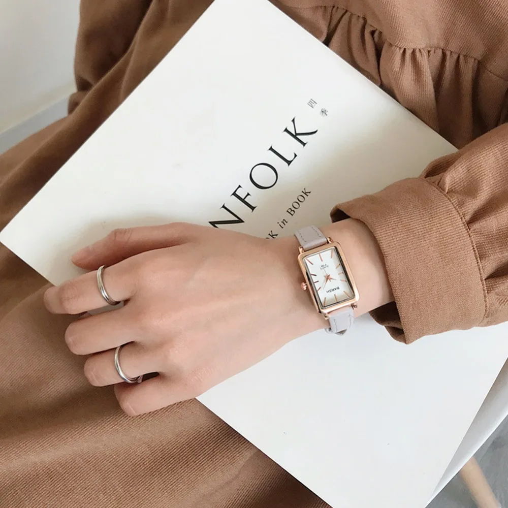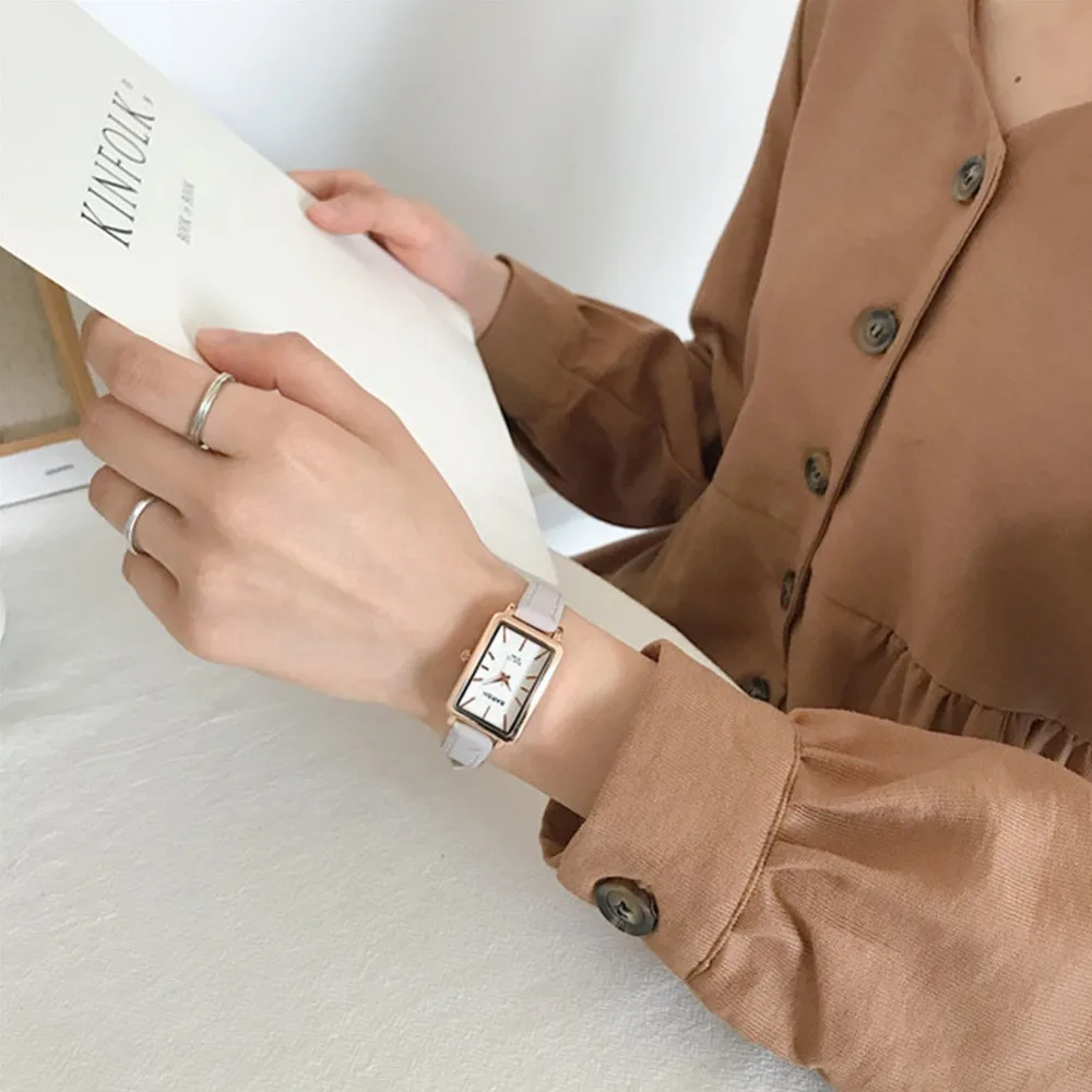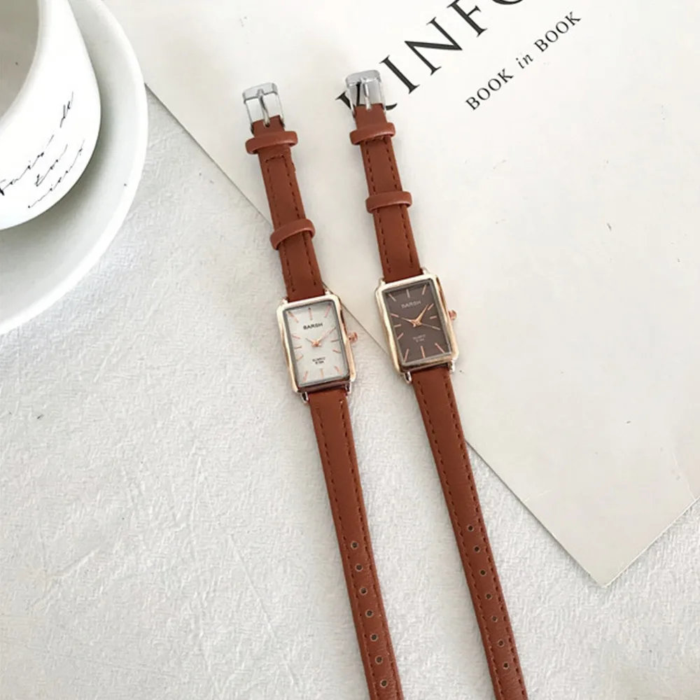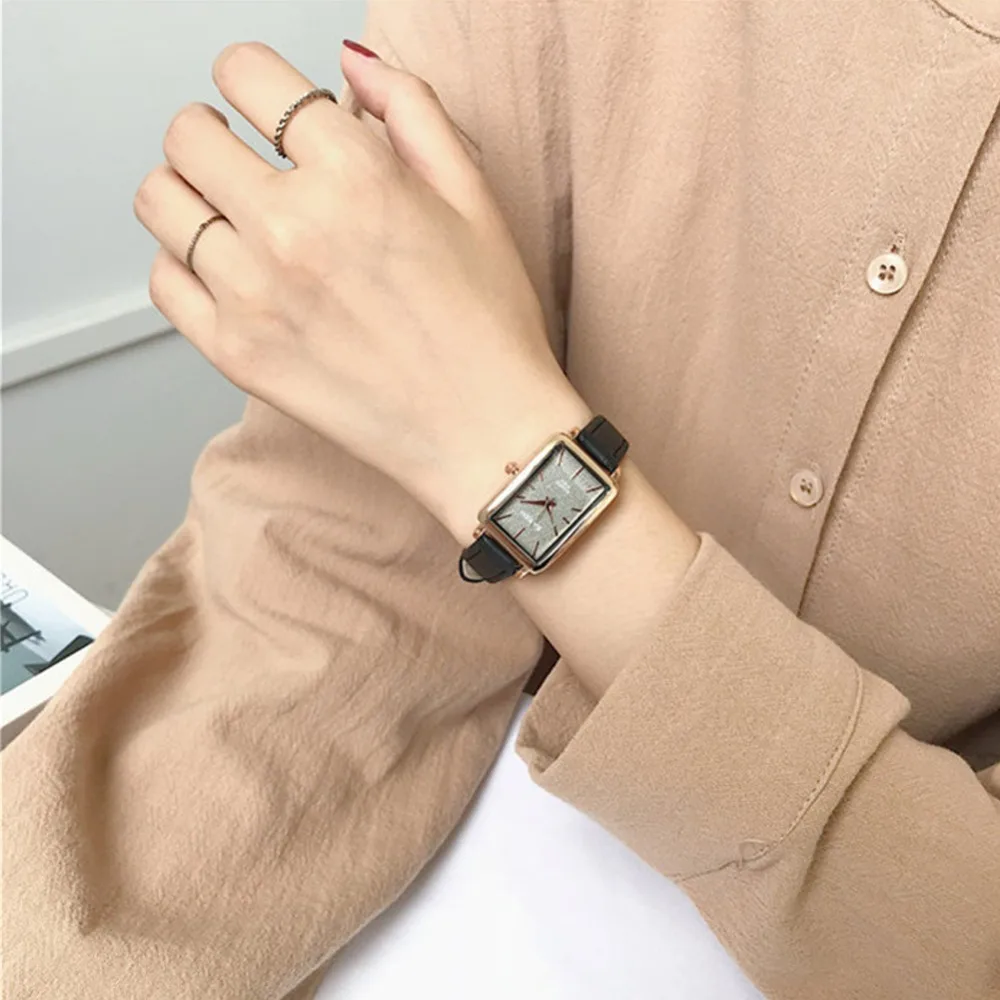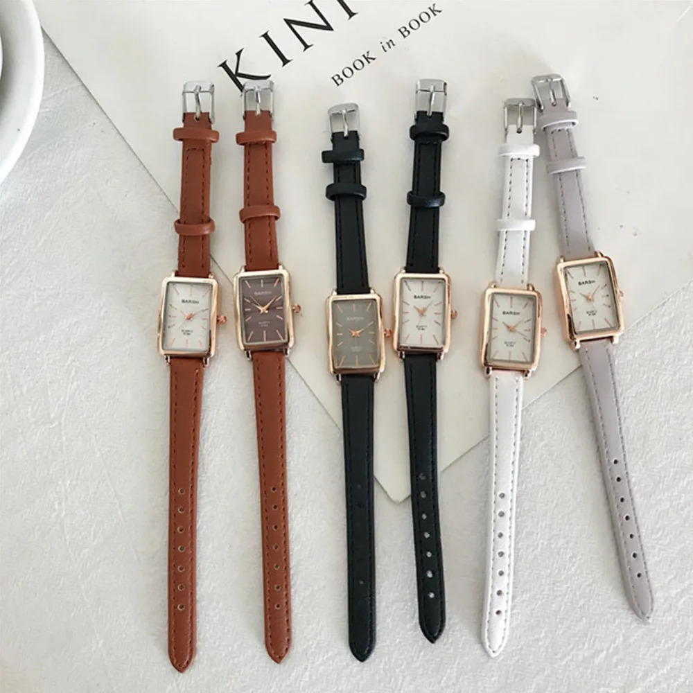 ساعة نسائية أنيقة وعصرية بتصميم كلاسيكي بسيط، تعمل بالكوارتز، بسوار جلدي، وحزام جلدي، وحزام مستطيل، بتصميم كلاسيكي فاخر، وطبعة سنابل قمح مربعة صغيرة.