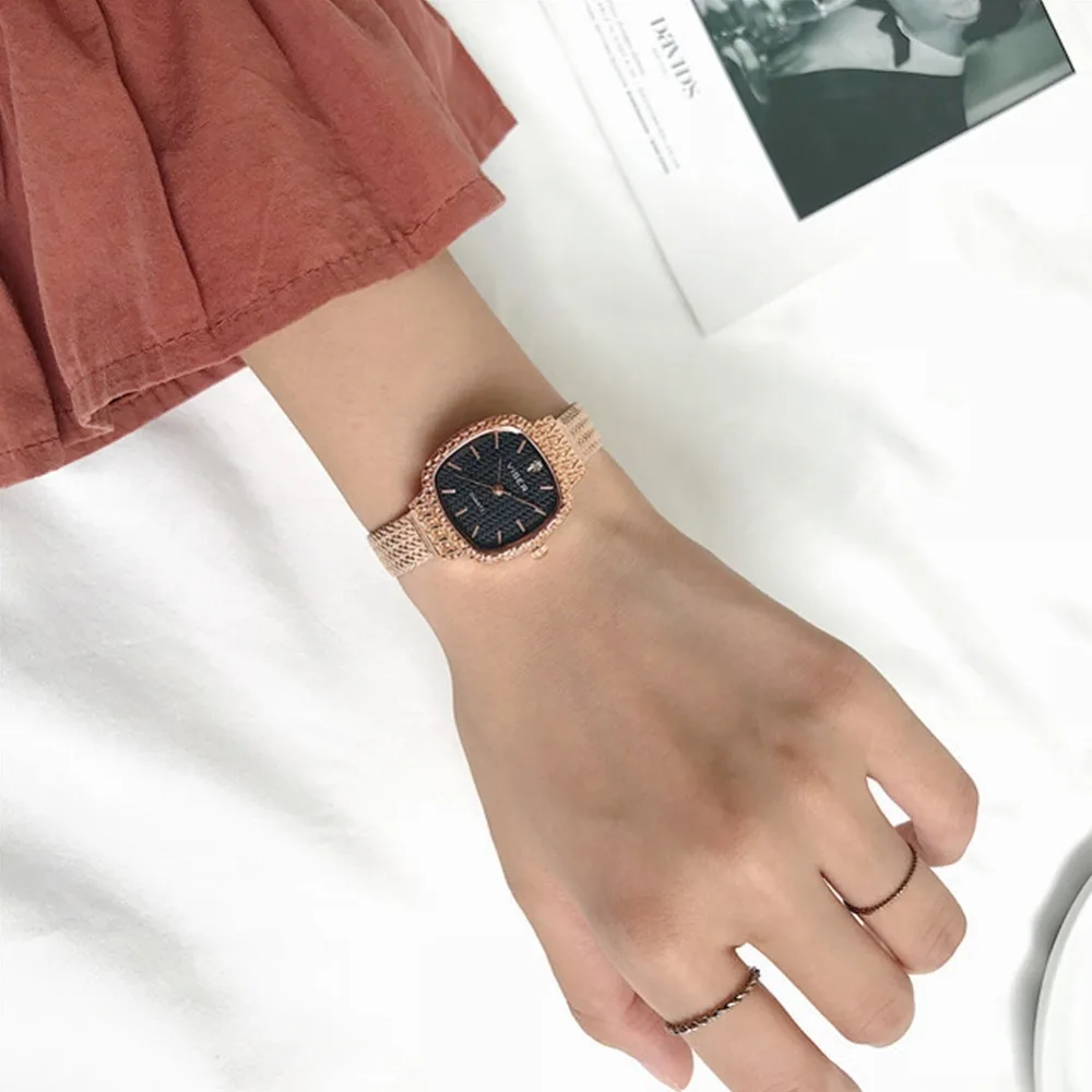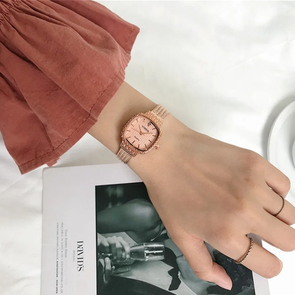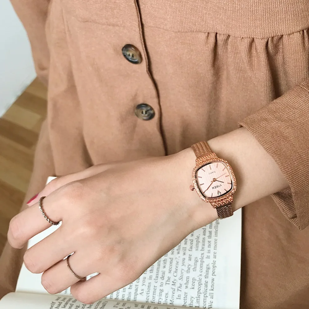 سوار أنيق وعصري من الذهب الوردي والفولاذ، مصنوع من الكوارتز، للنساء