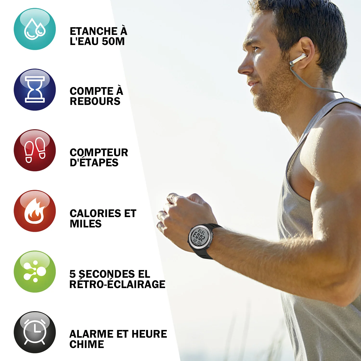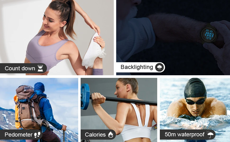 ساعة رياضية متعددة الوظائف، تحتوي على منبه وساعة توقيت وعد تنازلي، مما يوفر المزيد من الراحة لحياتك.