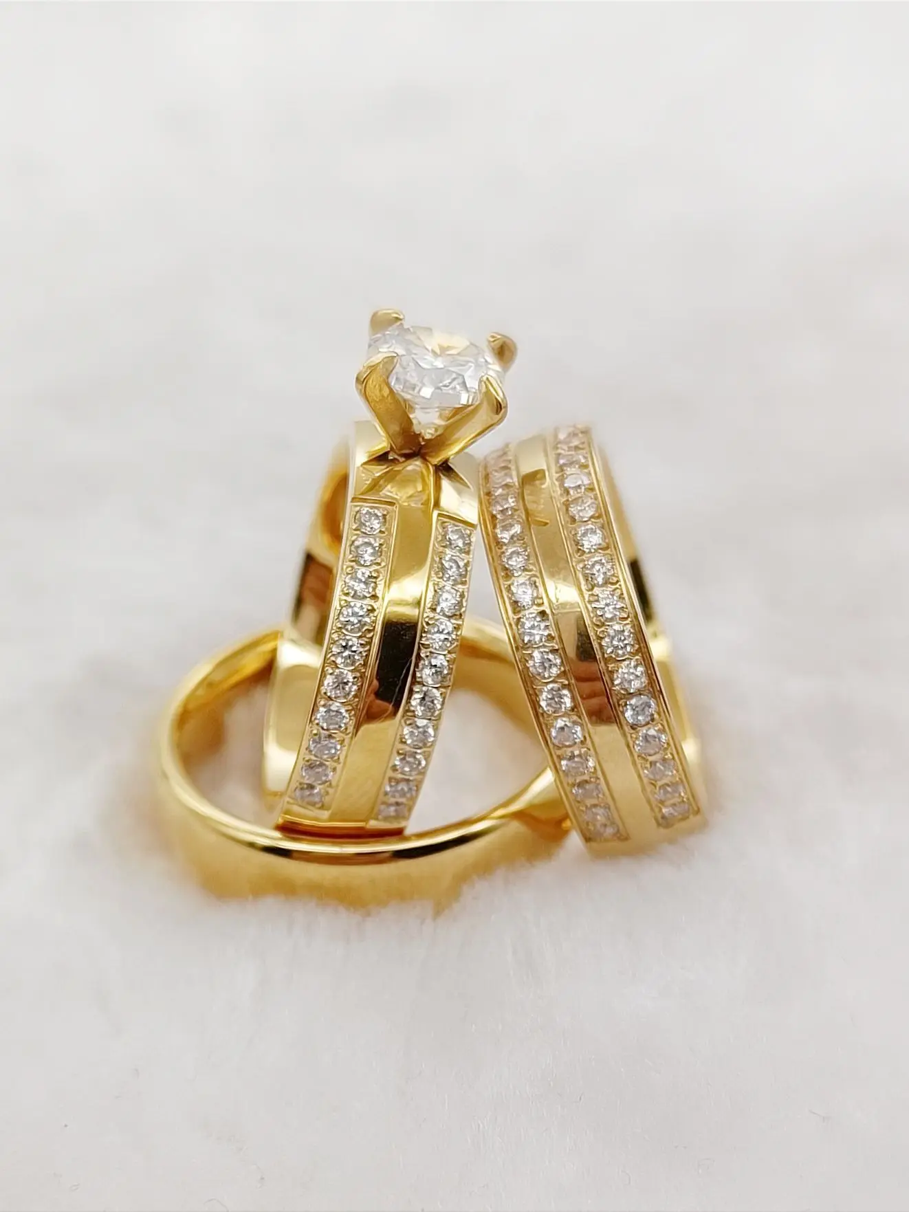 مجموعة خواتم خطوبة وزواج عالية الجودة مكونة من 3 قطع للأزواج مطلية بالذهب عيار 18 قيراطًا ومرصعة بالألماس، خاتم عشاق مجوهرات عصرية