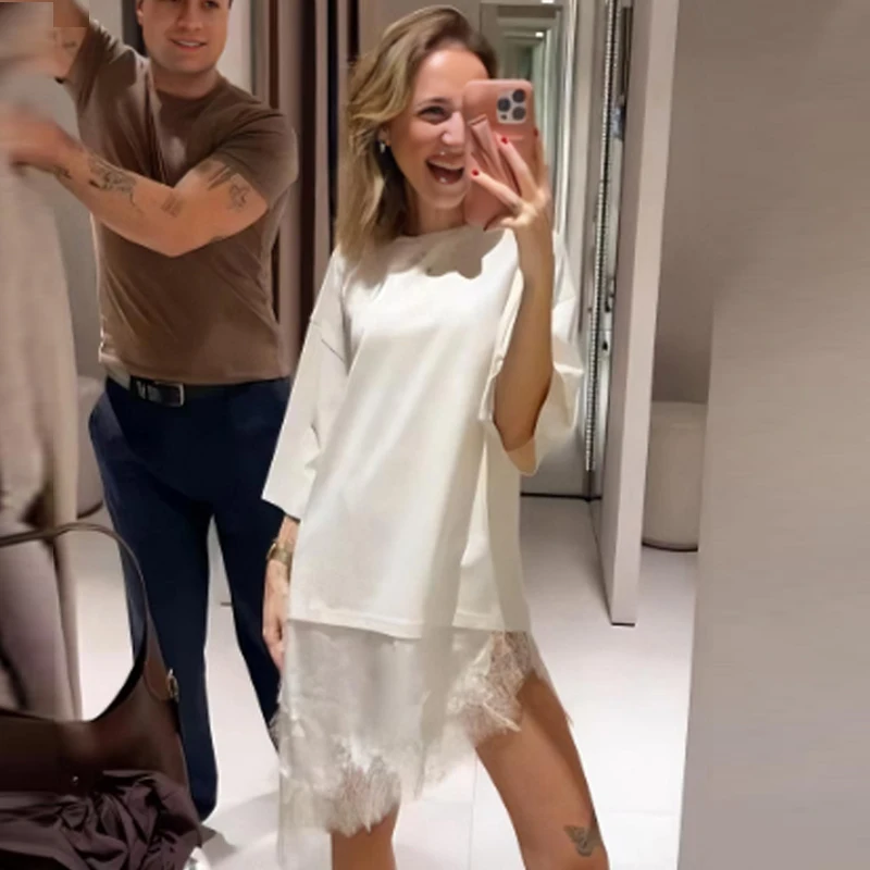تي شيرت HXAO من الدانتيل كبير الحجم مناسب للصيف والخريف للنساء Y2K بأكمام قصيرة باللون الأبيض العتيق تي شيرت طويل مقاس كبير أنيق من ملابس الشارع