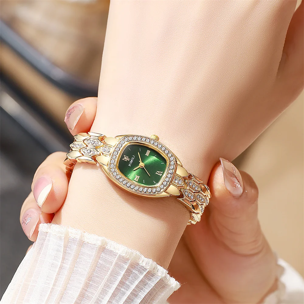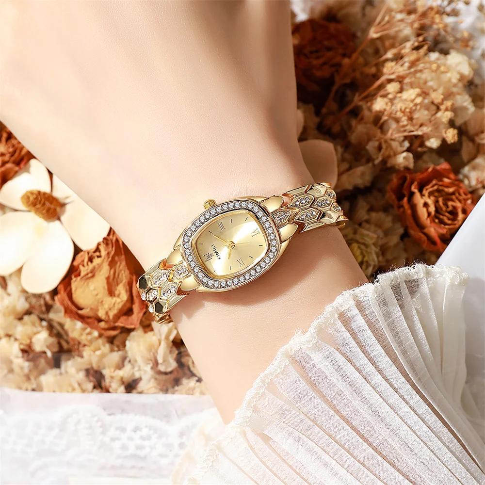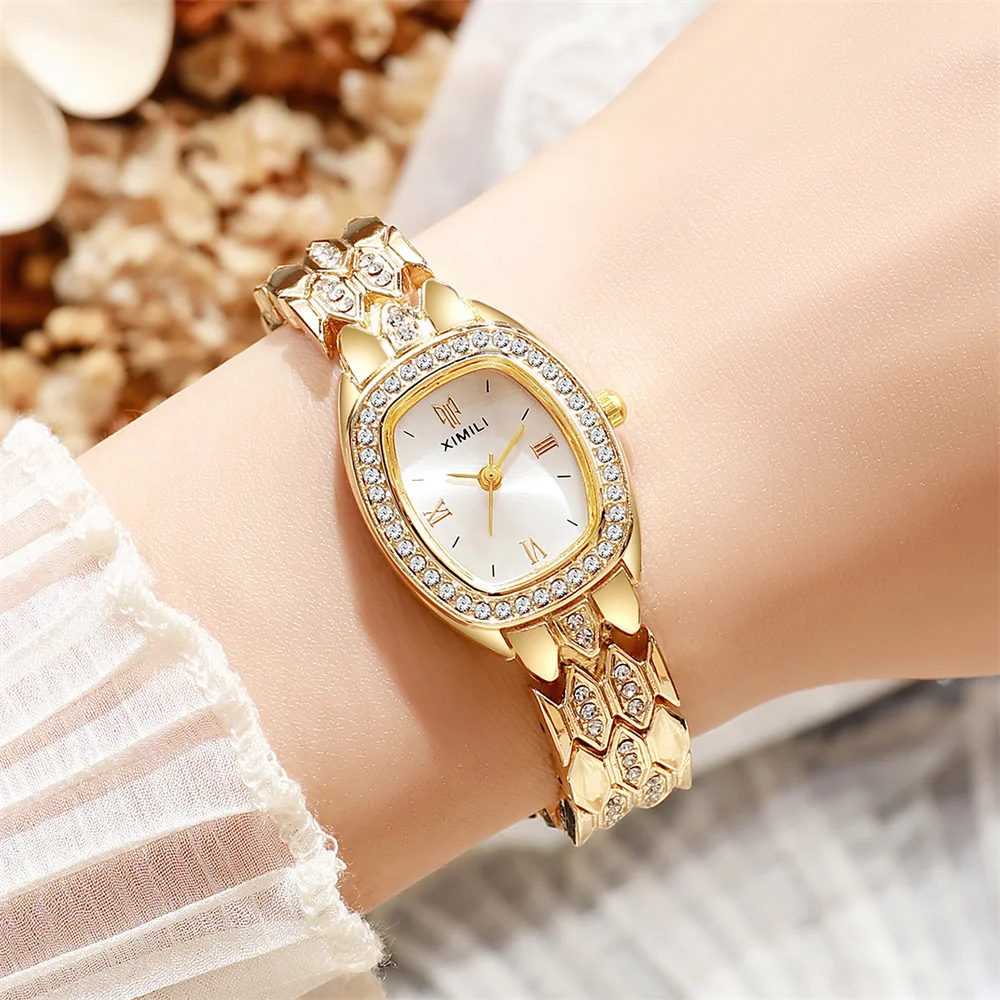 ساعة يد نسائية فاخرة مطلية بالذهب، تعمل بالكوارتز، بتصميم روماني بسيط، مصنوعة من الفولاذ المقاوم للصدأ، على شكل برميل، مناسبة للعمل، مزودة بحزام بإبزيم عالي الجودة.