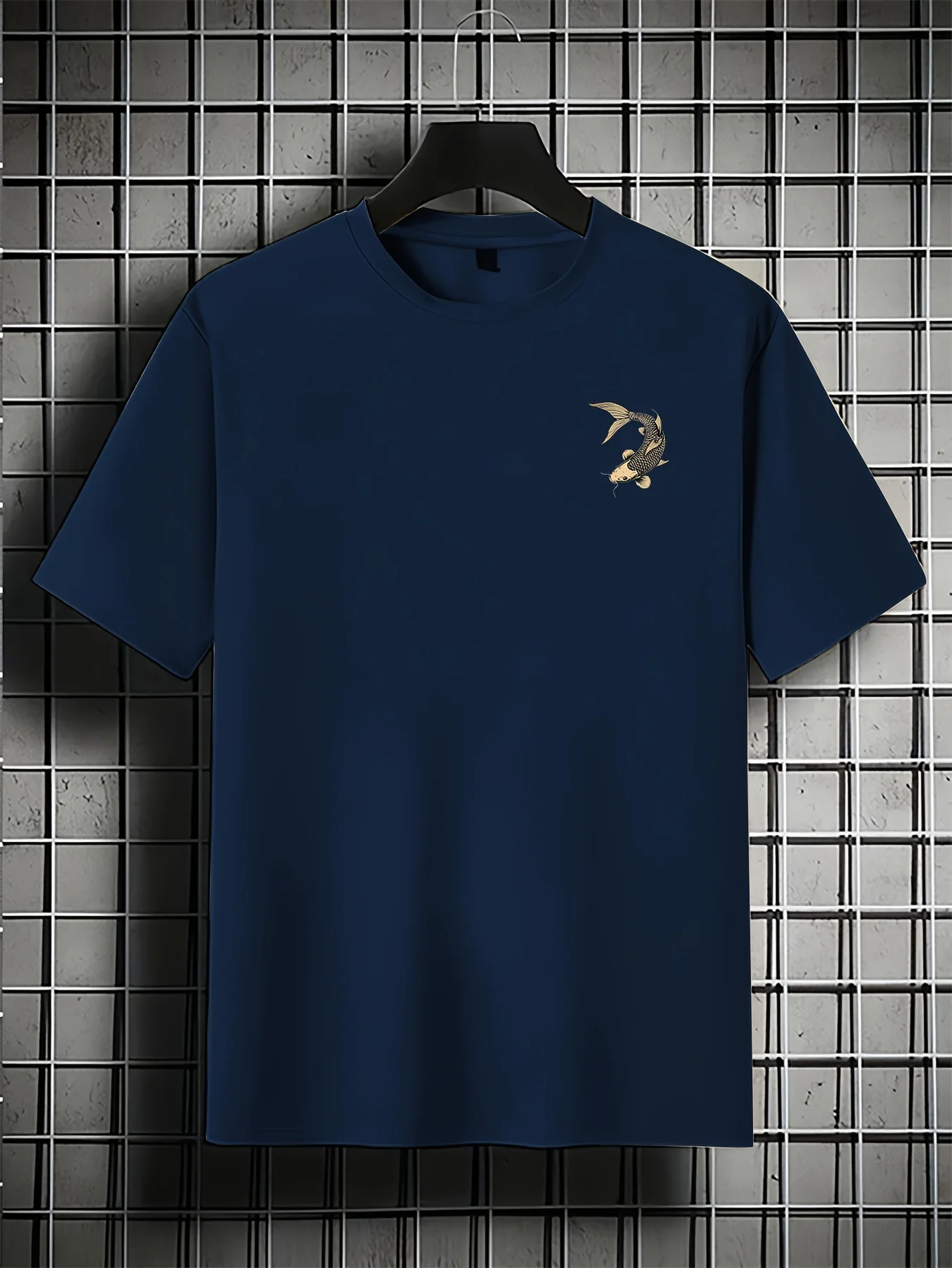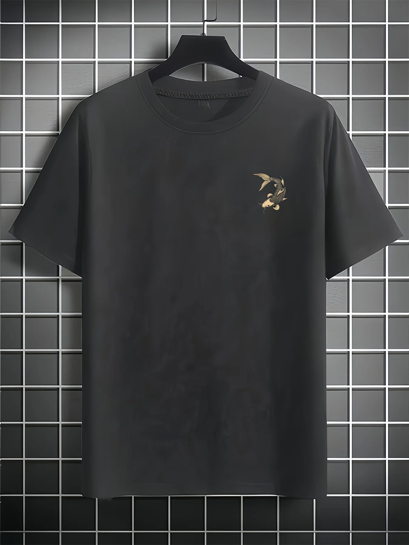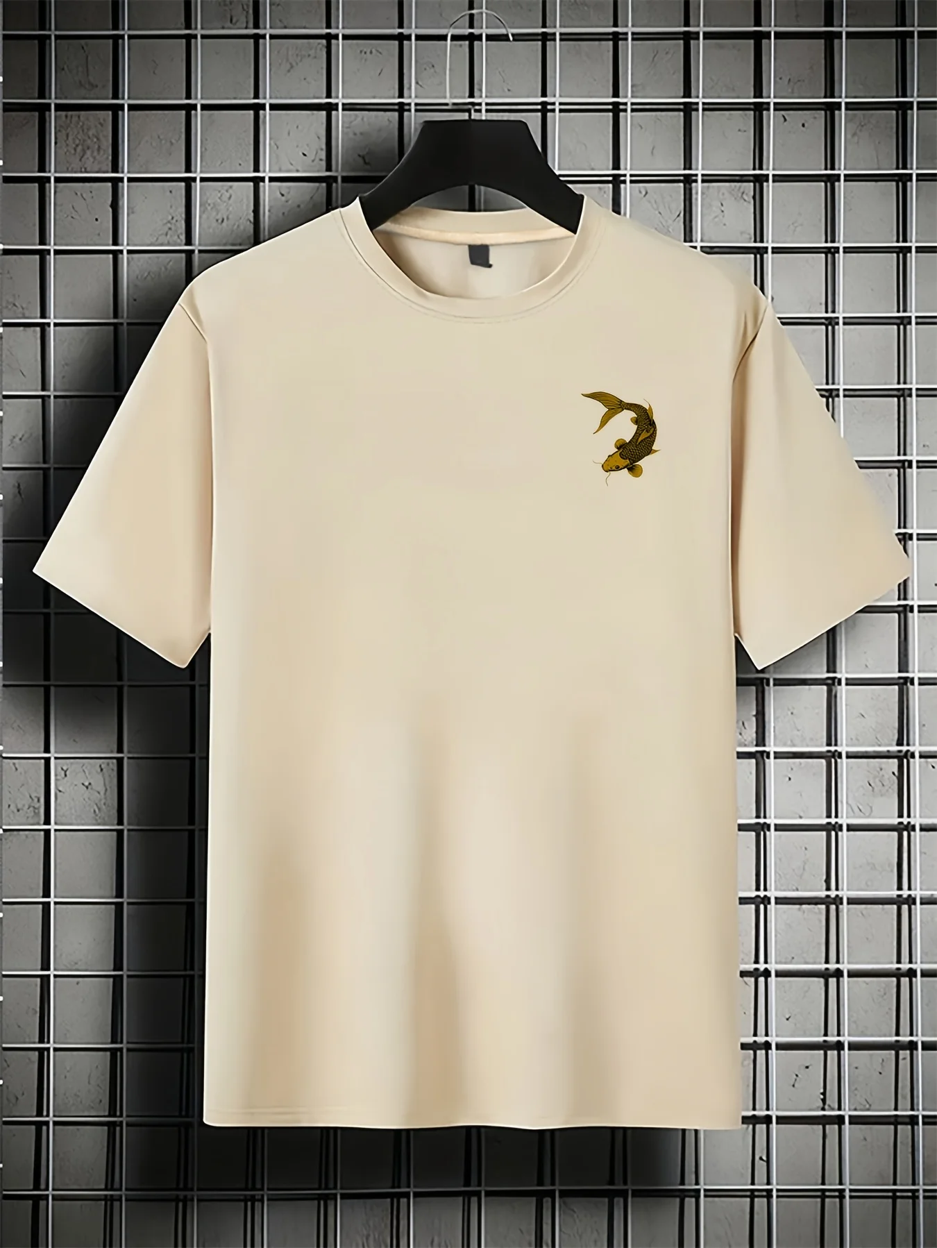 تيشيرت رجالي صيفي عصري فضفاض بنقشة سمكة ذهبية يابانية، مصنوع من القطن الخالص 100%، بياقة دائرية وأكمام قصيرة.
