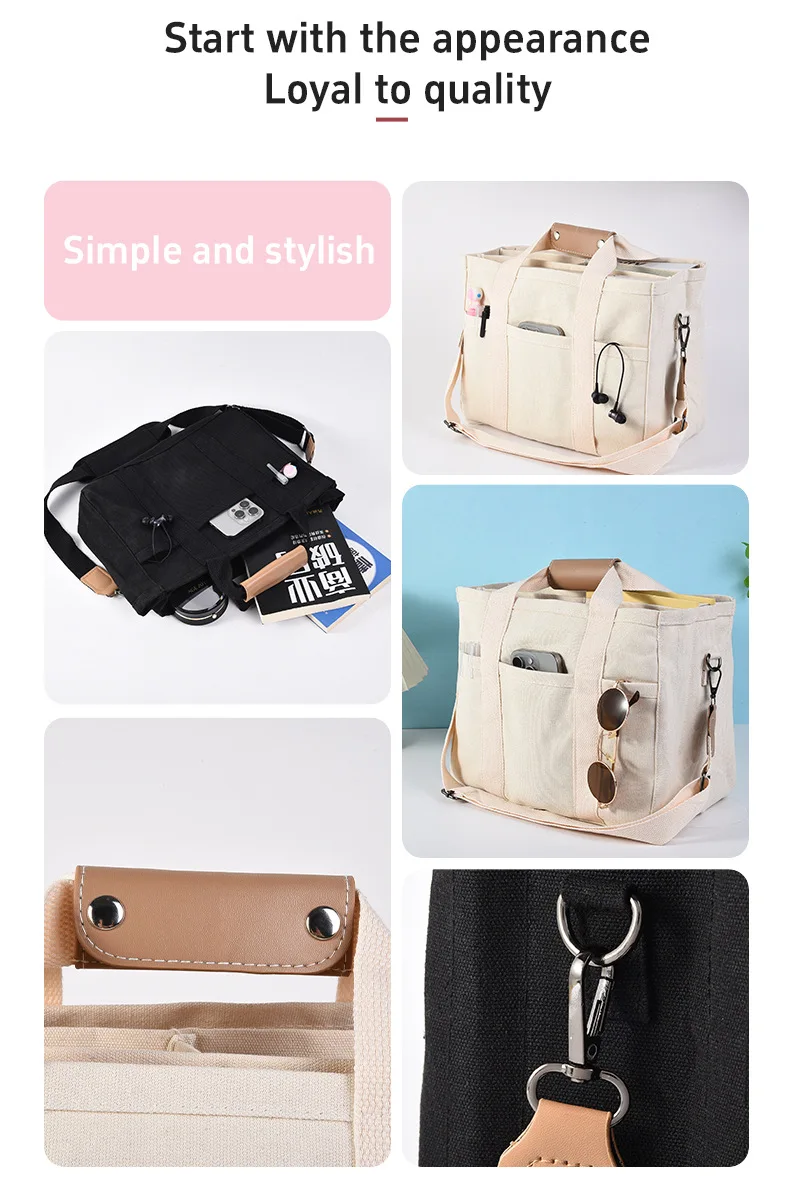 - جودة متينة : مصنوعة من قماش عالي الجودة، هذه الحقيبة مصممة لتدوم طويلاً خلال الاستخدام اليومي، بينما تضيف التفاصيل المزينة بالجلد لمسة من الأناقة.