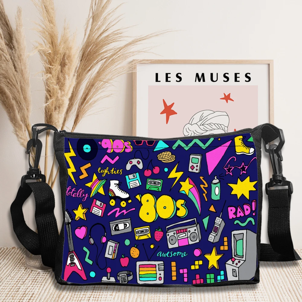 حقيبة كتف من البوليستر بتصميم شريط كاسيت، بنمط هندسي، وموضوع كرتوني، مع حزام كتف للسفر والاستخدام اليومي