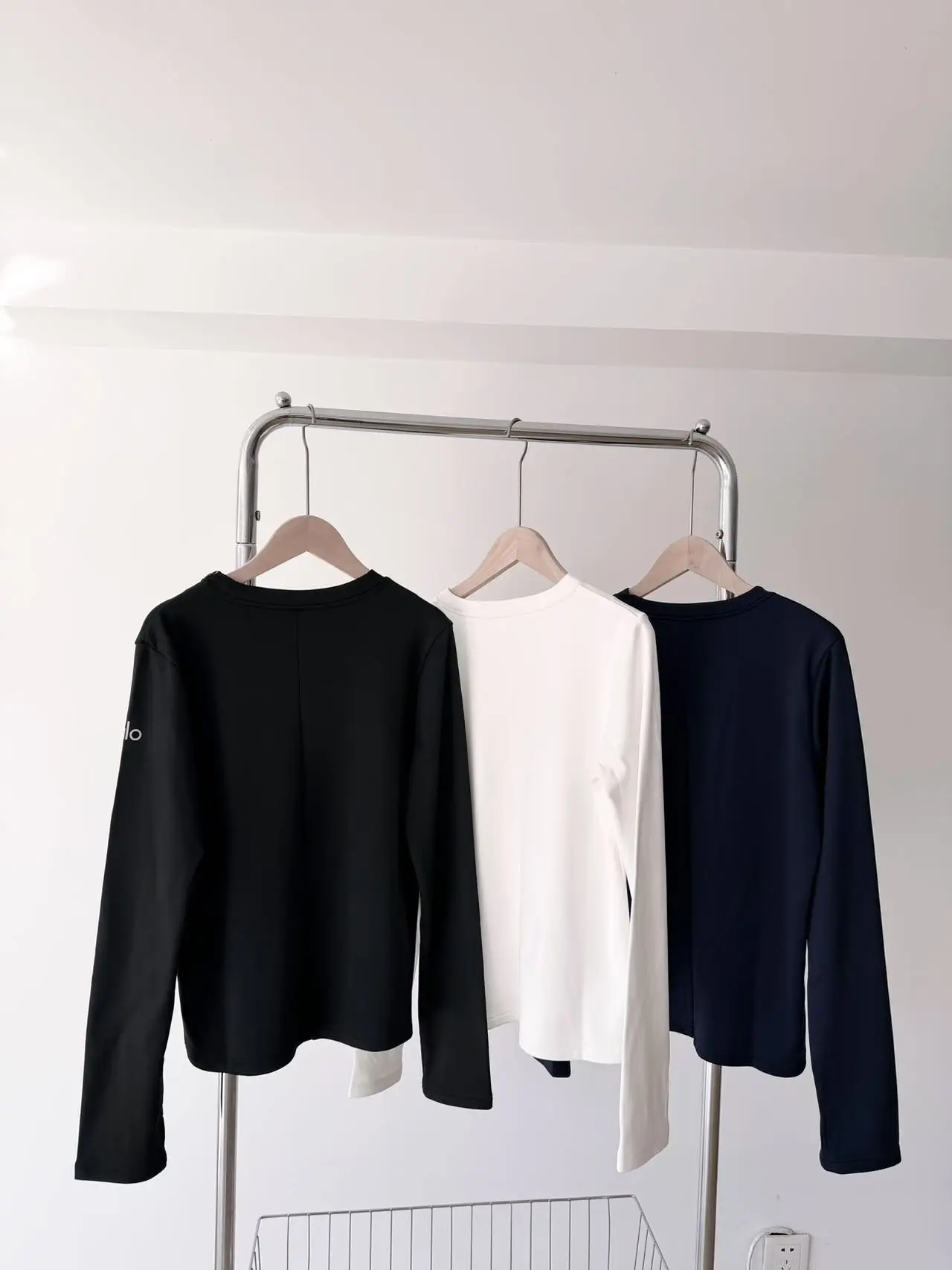 قميص رياضي نسائي بأكمام طويلة ورقبة دائرية مطاطية من الأسفل، تي شيرت يوجا، لياقة بدنية، جري، سويت شيرت أسود كحلي سادة للنساء