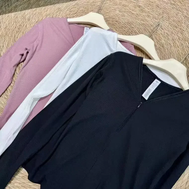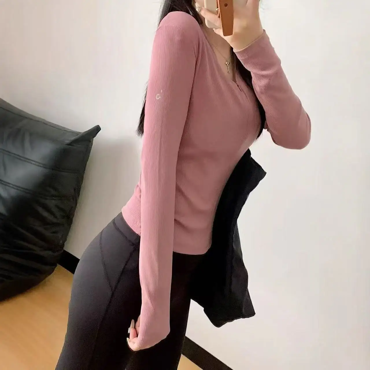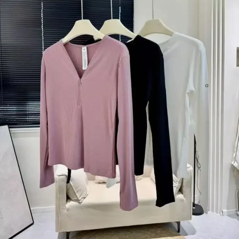قمصان يوغا رياضية بأكمام طويلة للنساء، سريعة الجفاف، لياقة بدنية، بيلاتيس، تي شيرت برقبة على شكل حرف V، لون أسود سادة، ضيق، تدريب نسائي