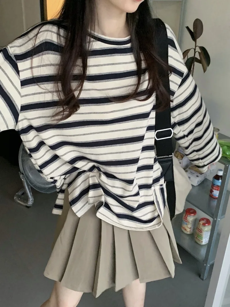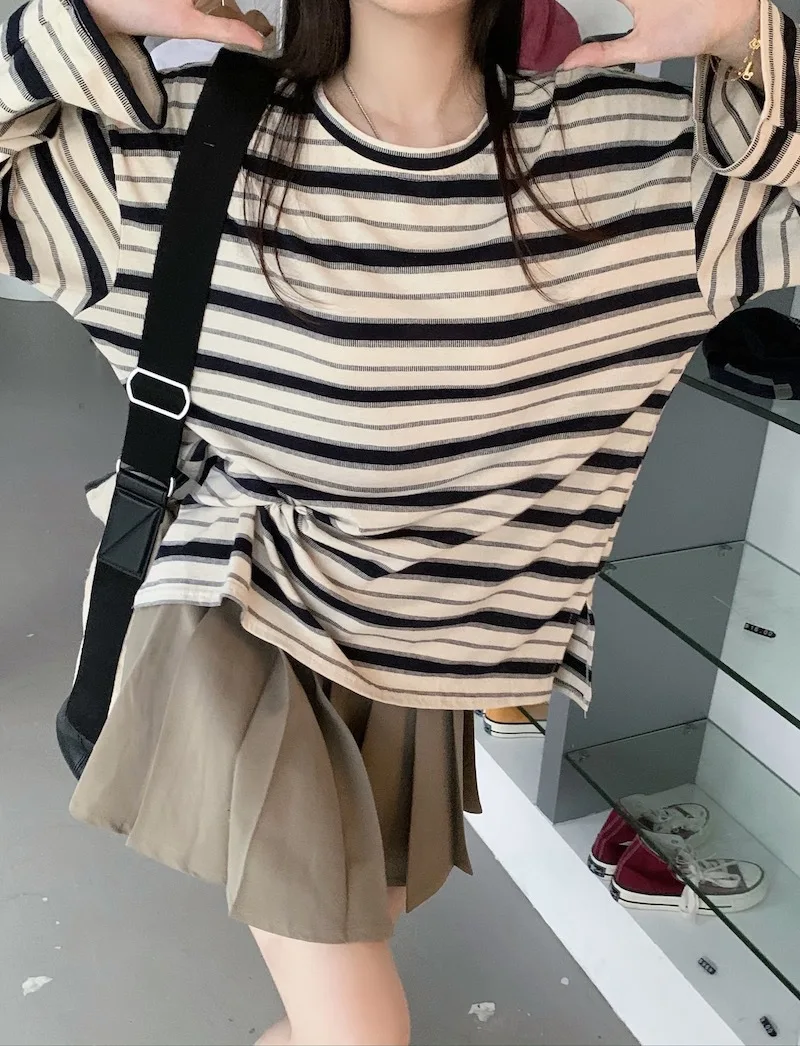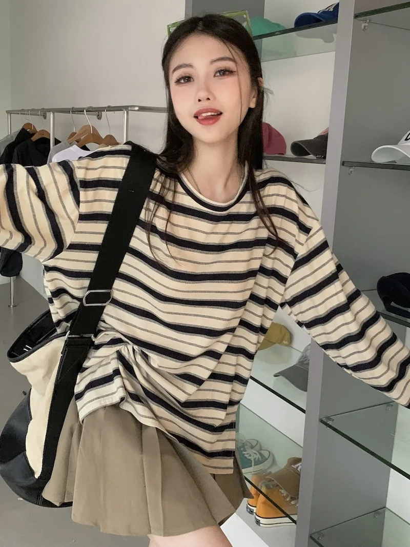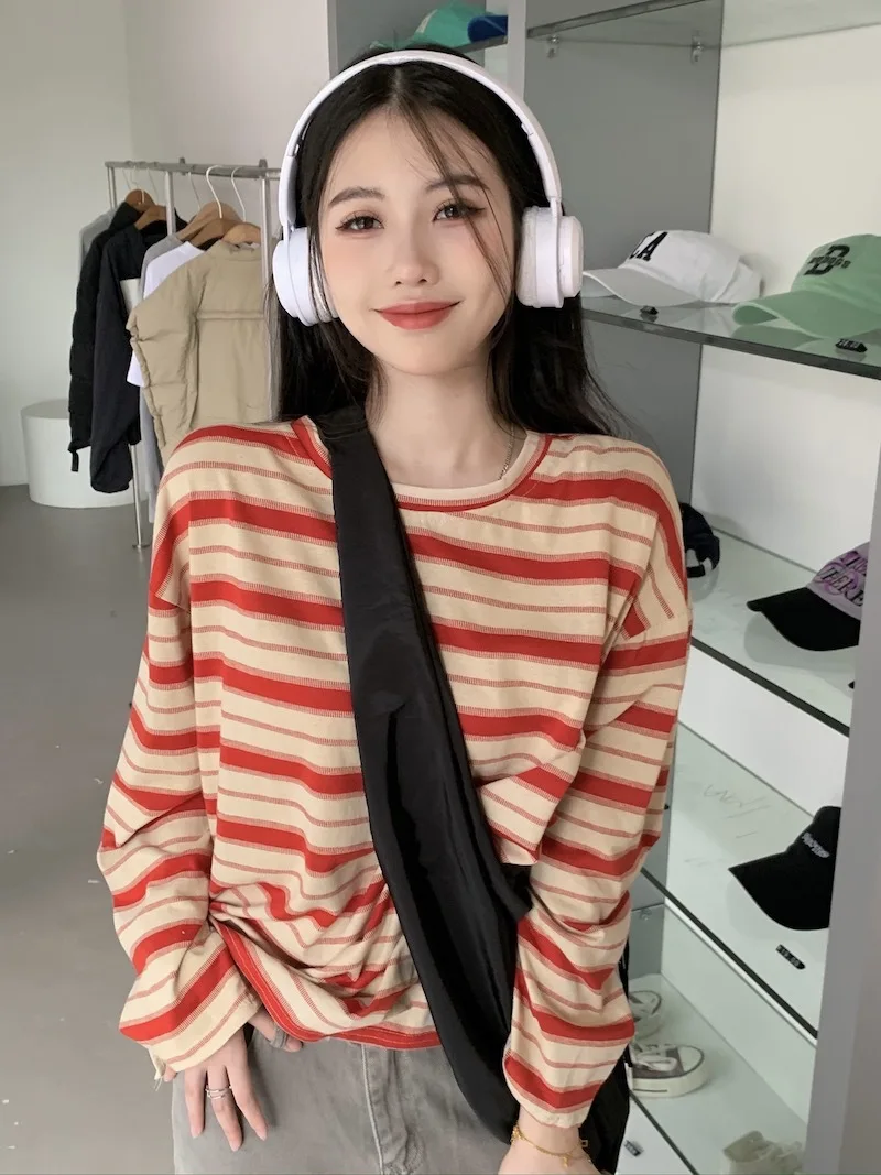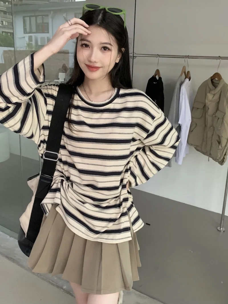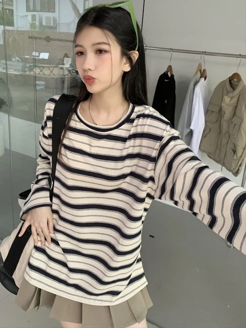 تيشيرت نسائي ربيعي مخطط بأكمام طويلة ورقبة دائرية، تصميم فضفاض أنيق مناسب للطالبات، مناسب لفصل الخريف 2025