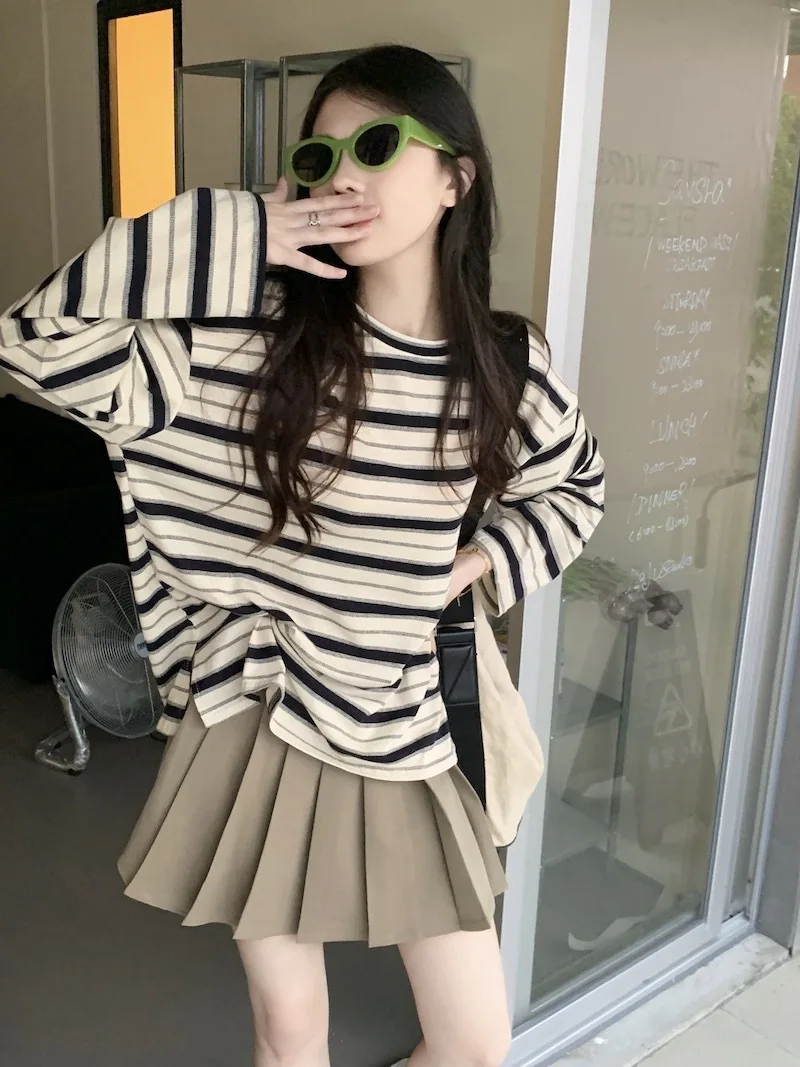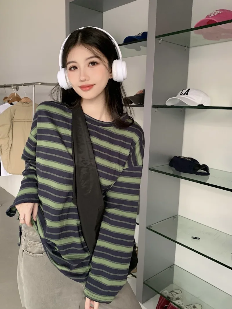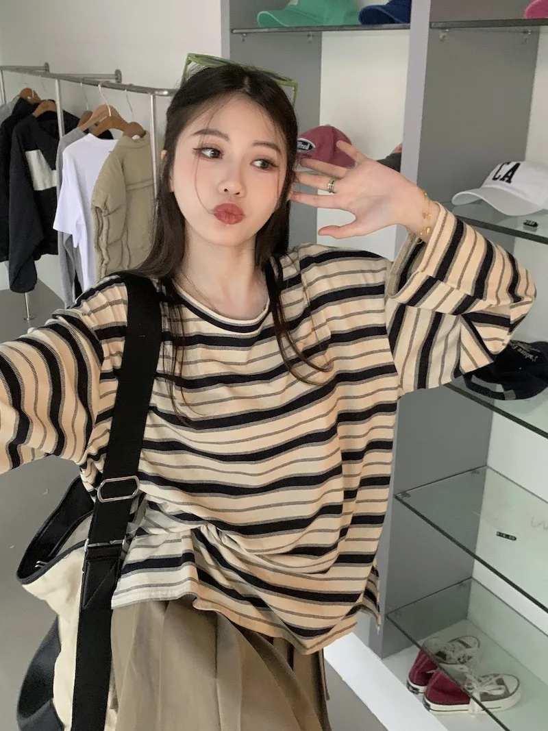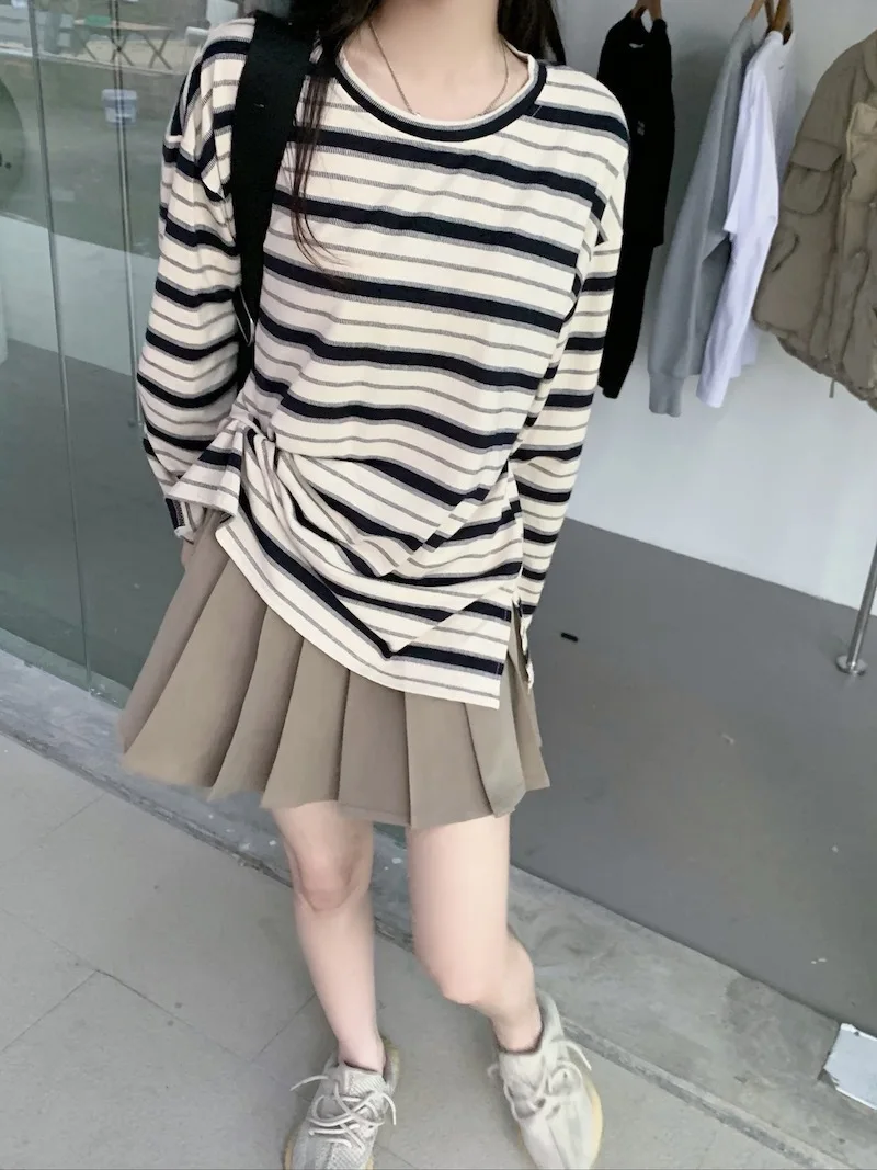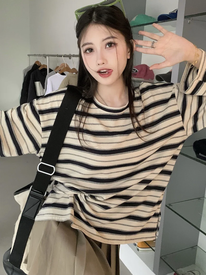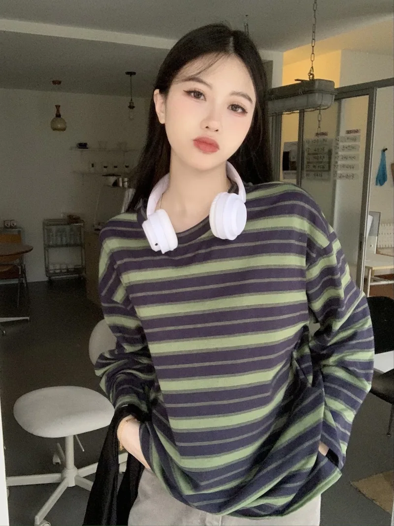 تيشيرت نسائي ربيعي مخطط بأكمام طويلة ورقبة دائرية، تصميم فضفاض أنيق مناسب للطالبات، مناسب لفصل الخريف 2025