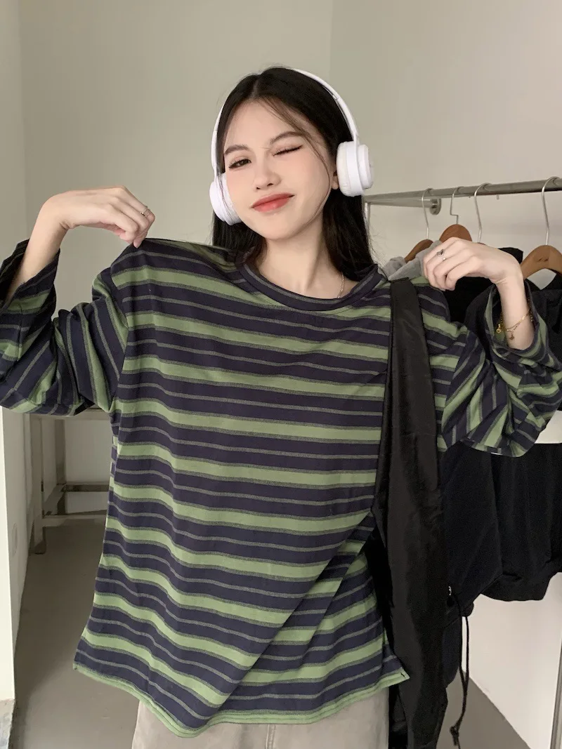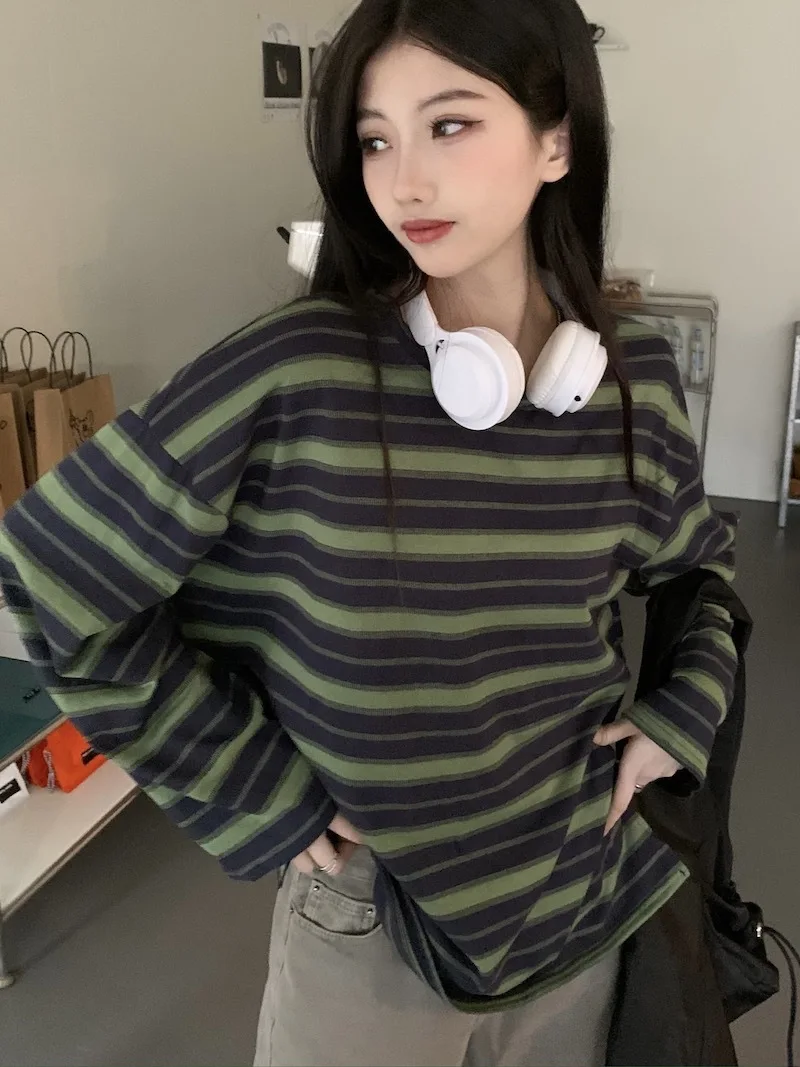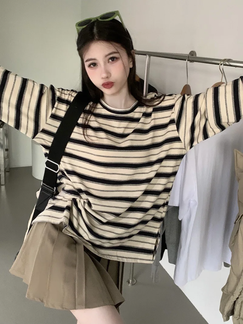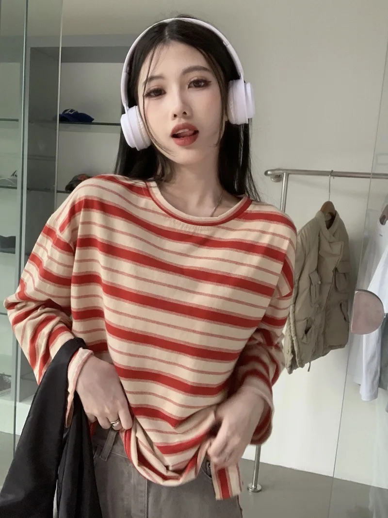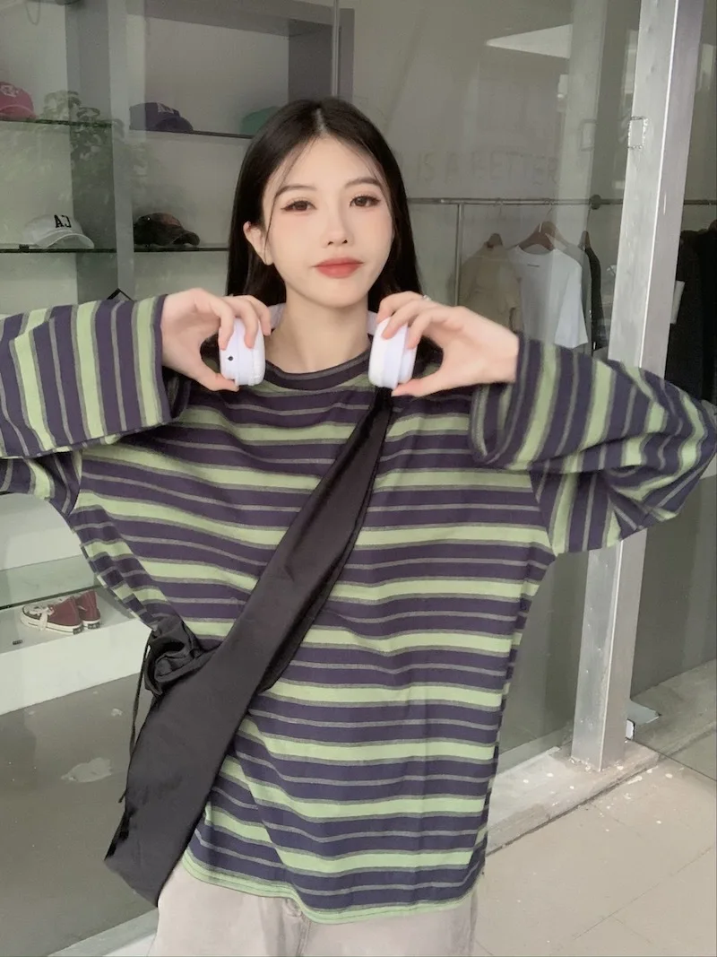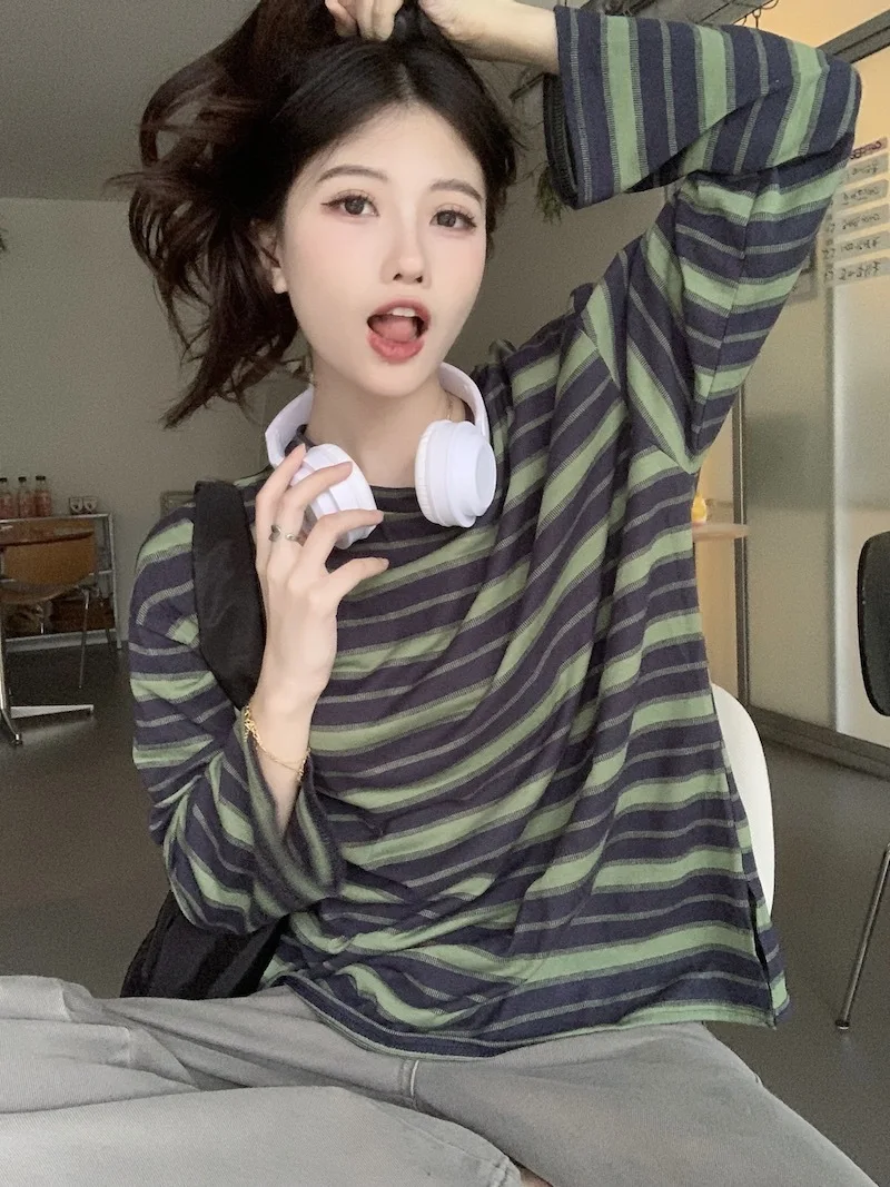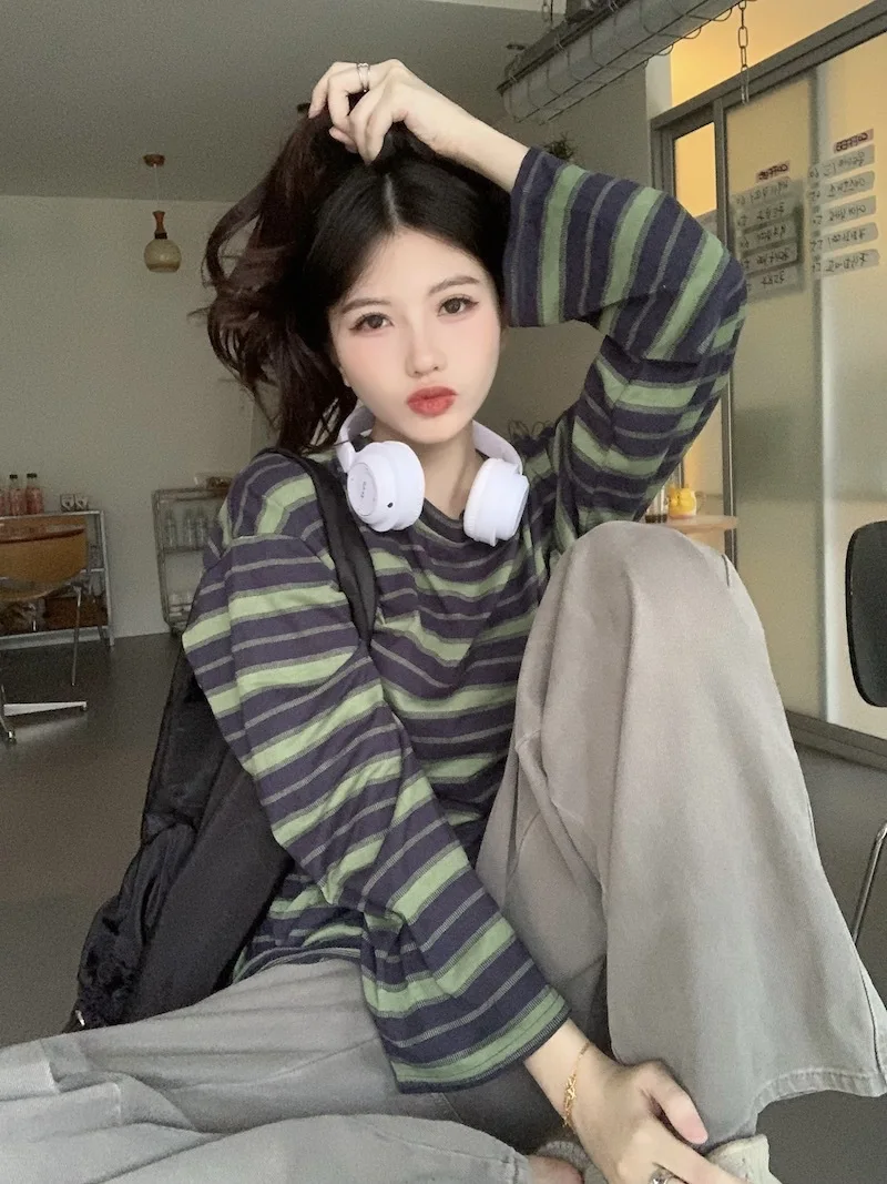 تيشيرت نسائي ربيعي مخطط بأكمام طويلة ورقبة دائرية، تصميم فضفاض أنيق مناسب للطالبات، مناسب لفصل الخريف 2025