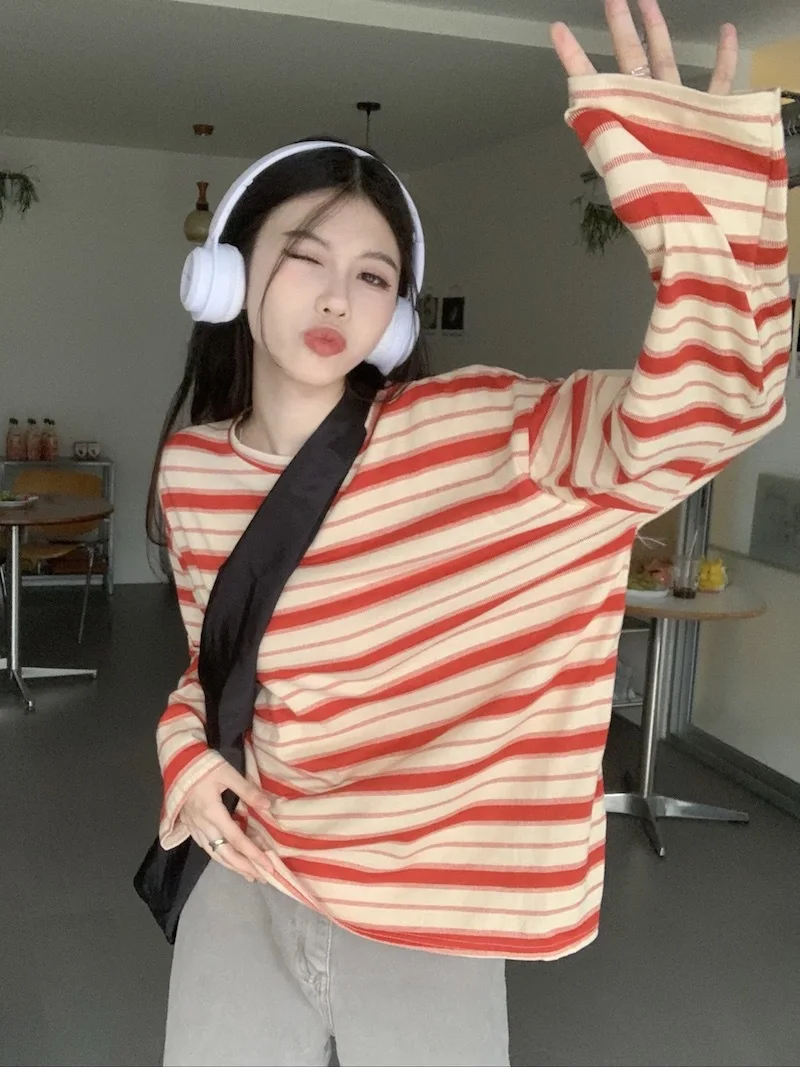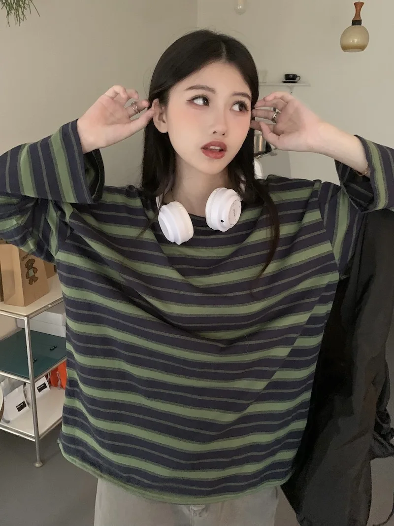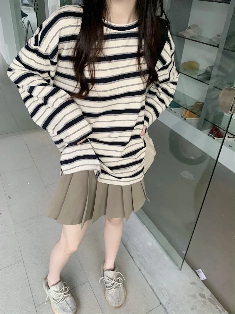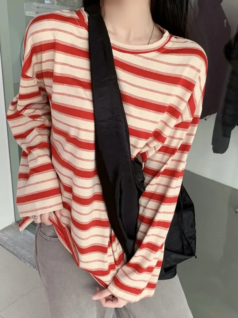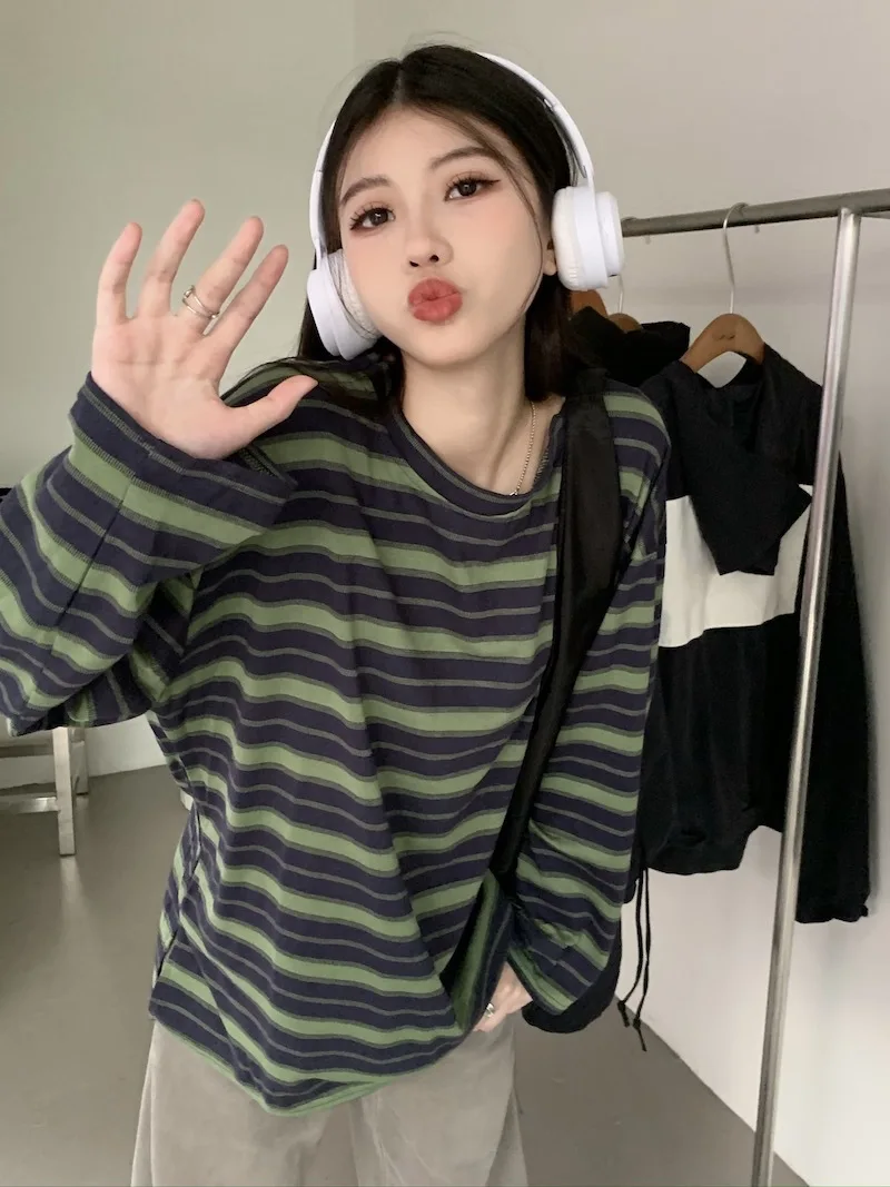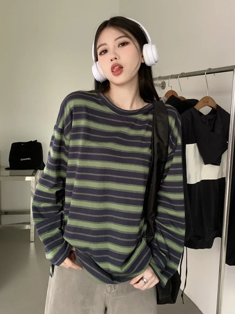 تيشيرت نسائي ربيعي مخطط بأكمام طويلة ورقبة دائرية، تصميم فضفاض أنيق مناسب للطالبات، مناسب لفصل الخريف 2025