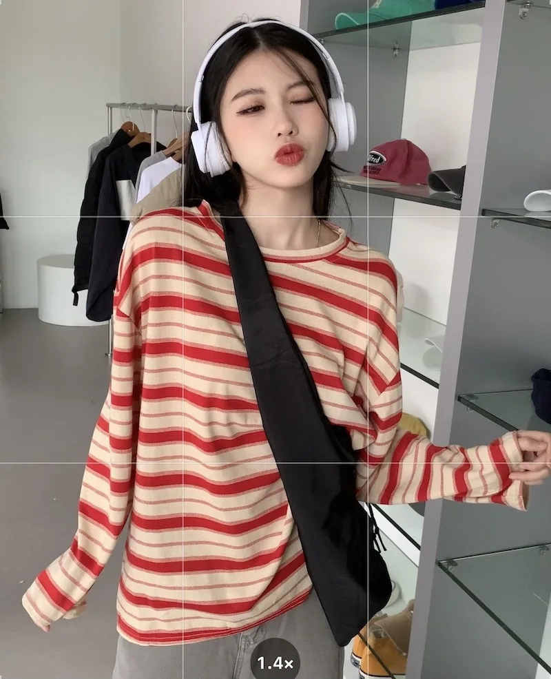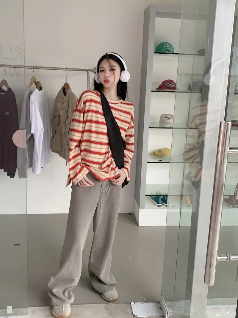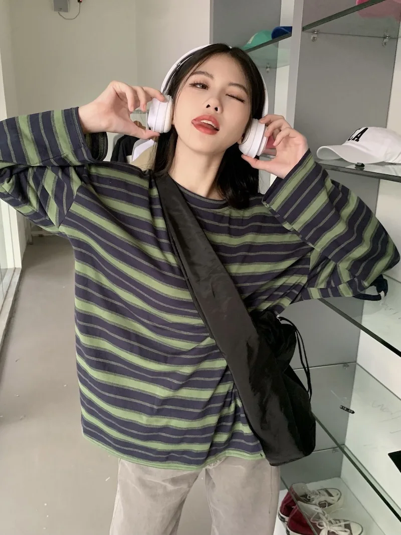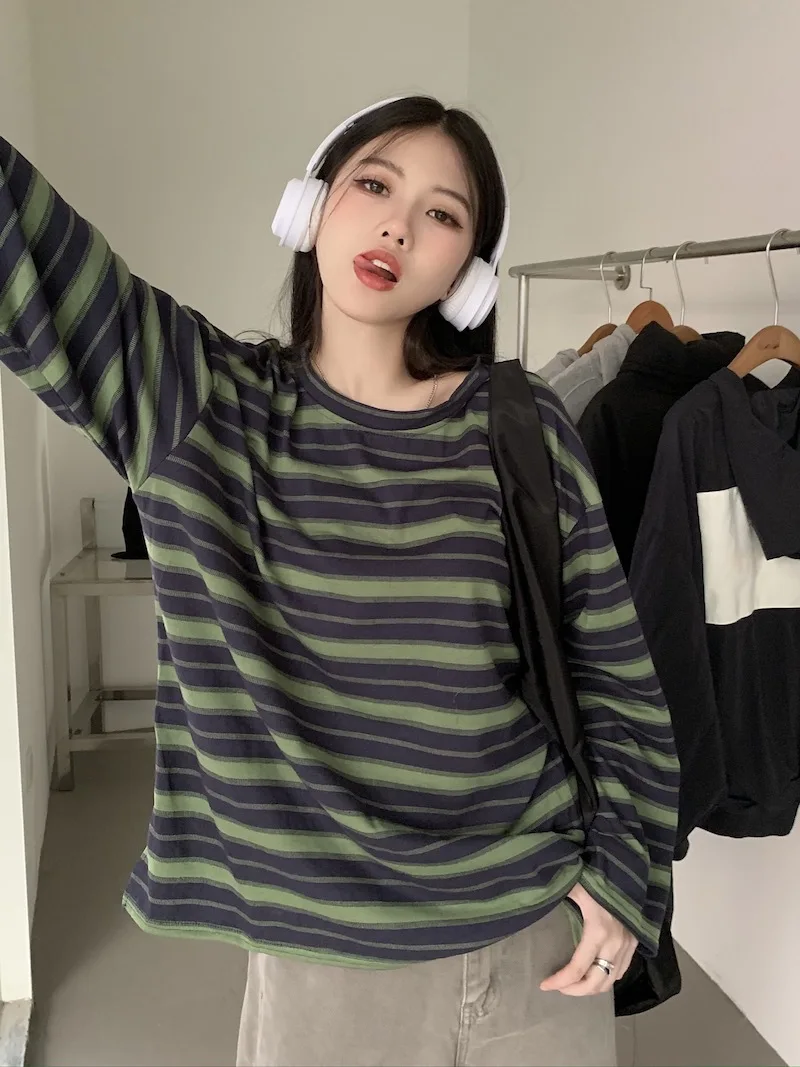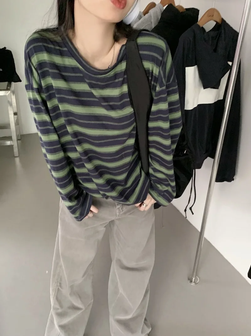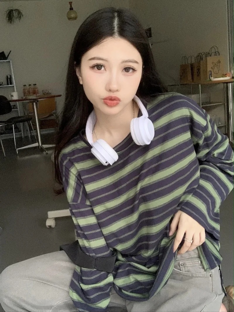 تيشيرت نسائي ربيعي مخطط بأكمام طويلة ورقبة دائرية، تصميم فضفاض أنيق مناسب للطالبات، مناسب لفصل الخريف 2025
