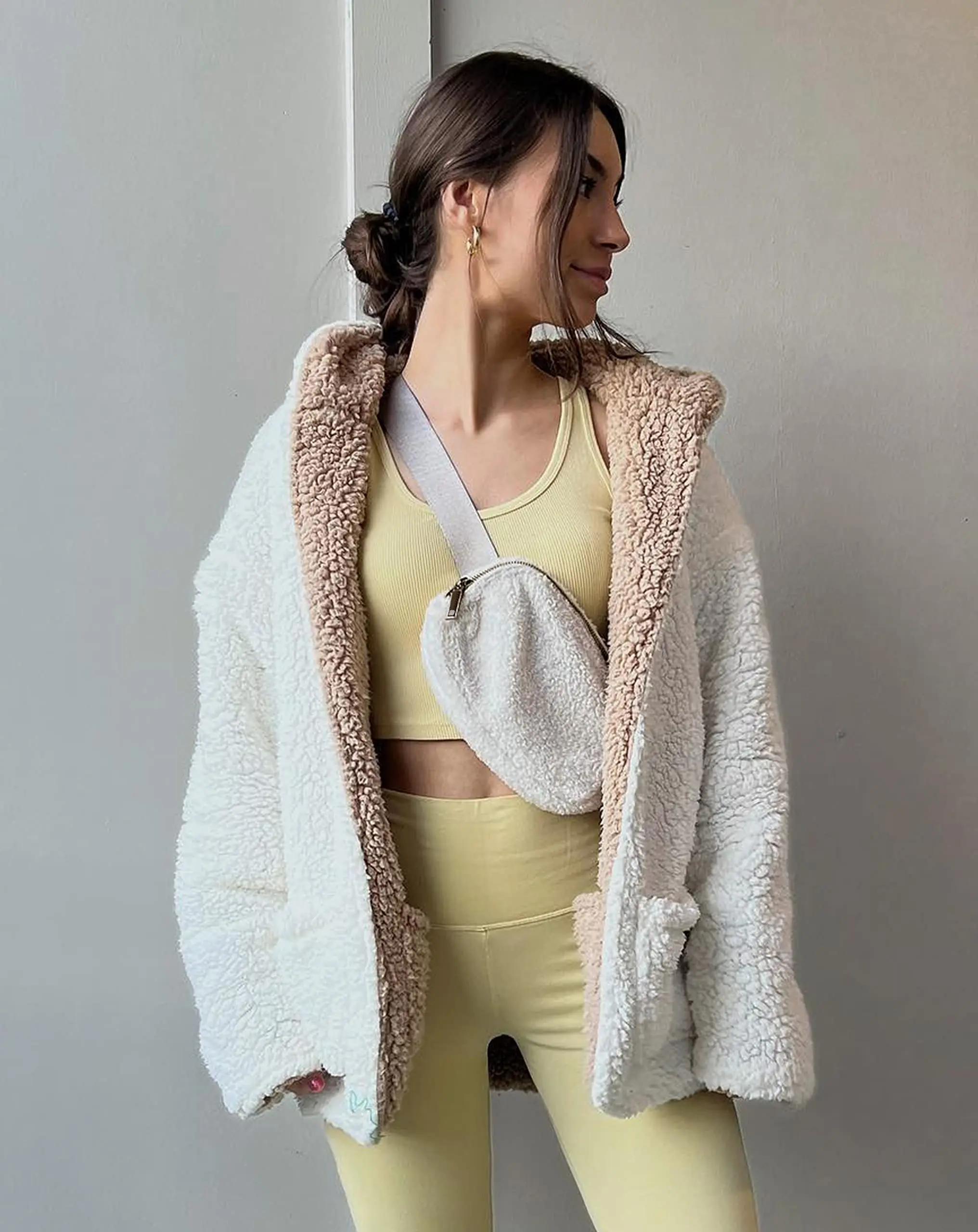 حقيبة حزام من الصوف الشتوي لكل مكان حقيبة كروس بودي نسائية بيضاء حقيبة خصر صغيرة بحزام قابل للتعديل (عاجي)
