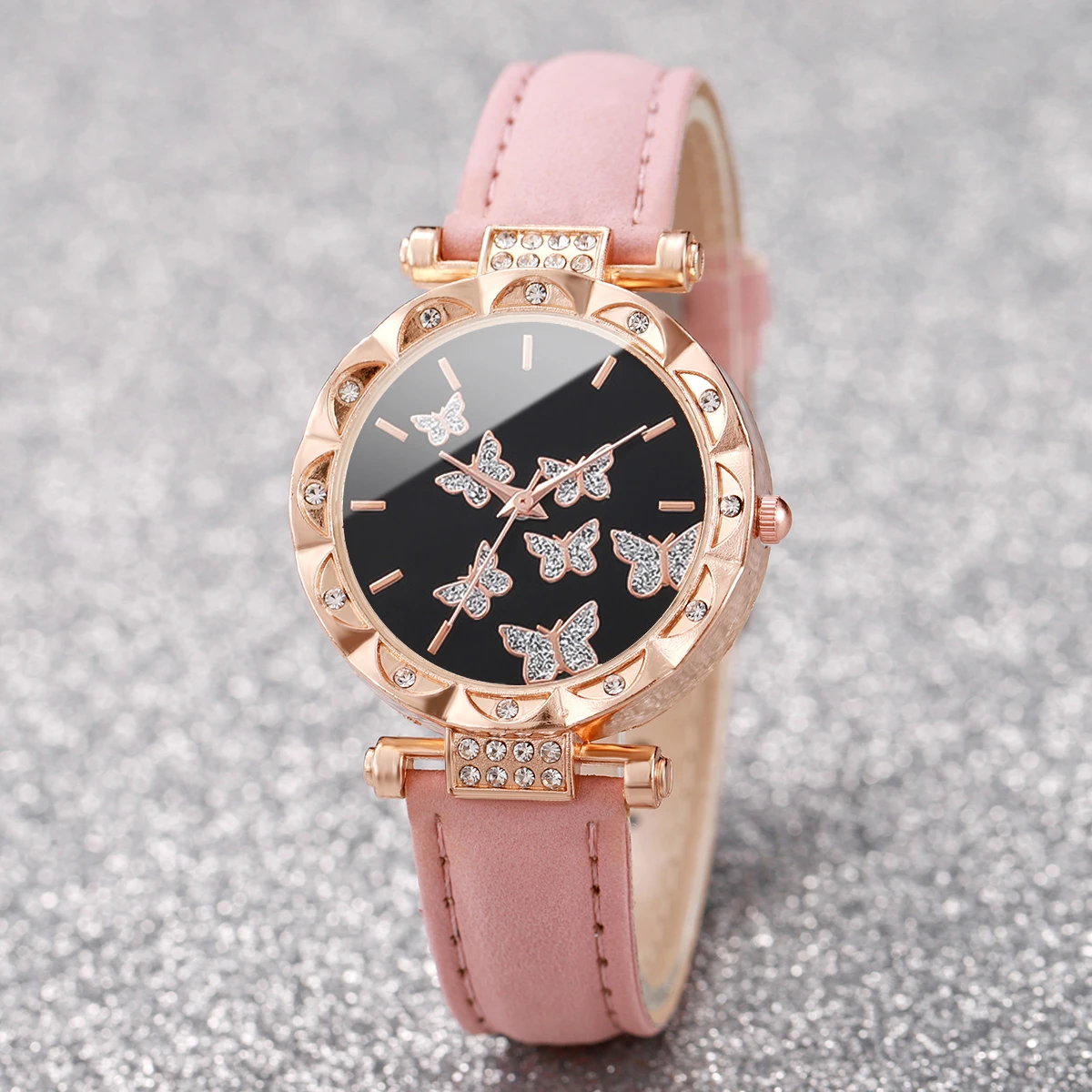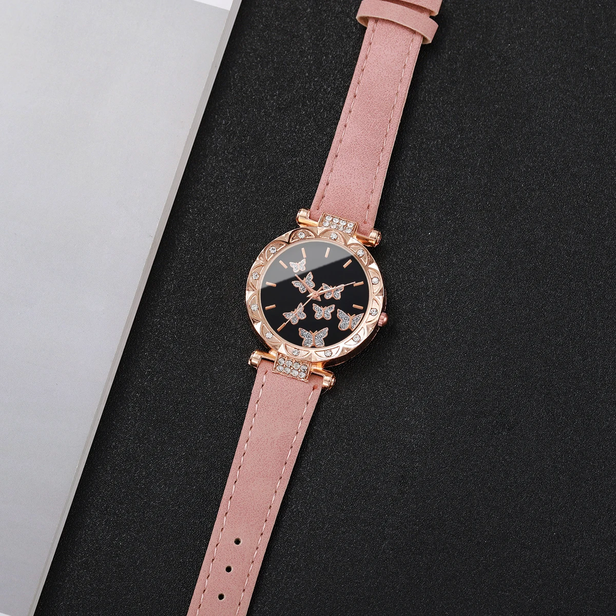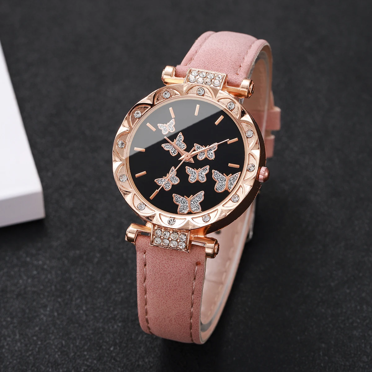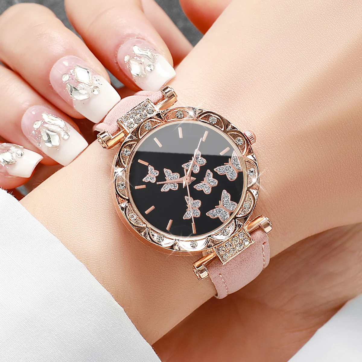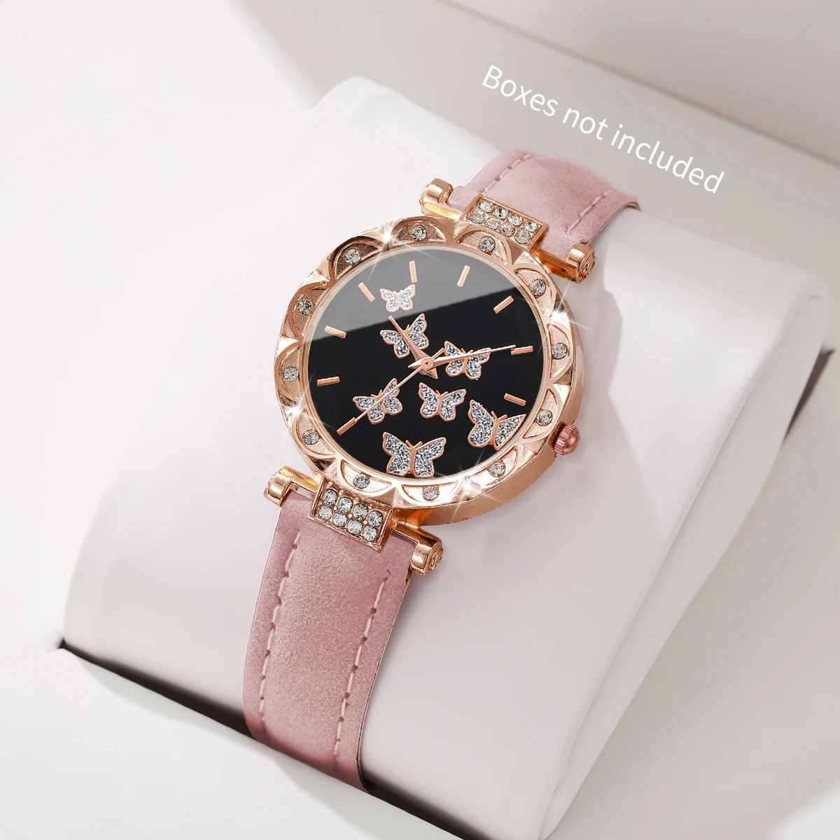 ساعة يد نسائية أنيقة مزينة بفراشة مرصعة بأحجار الراين، سوار جلدي، ساعة كوارتز (بدون علبة)