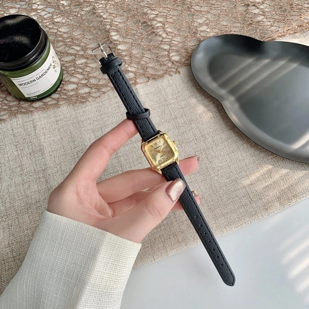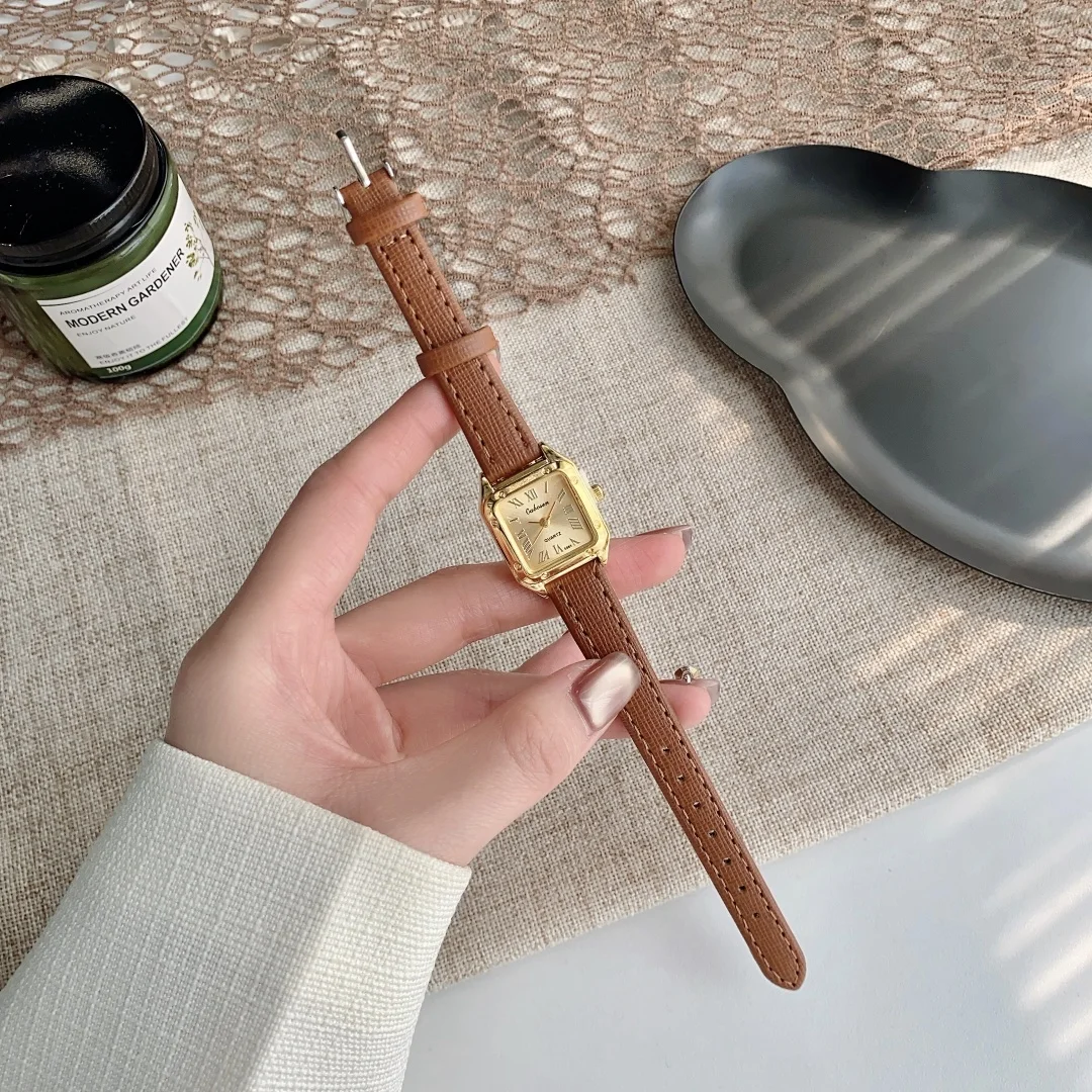 ساعة نسائية صغيرة مربعة المينا، سوار جلدي رفيع، ساعة يد أنيقة كوارتز، ساعة نسائية كاجوال