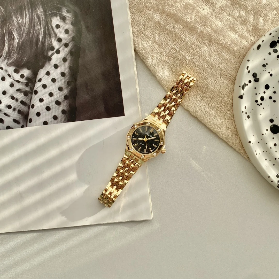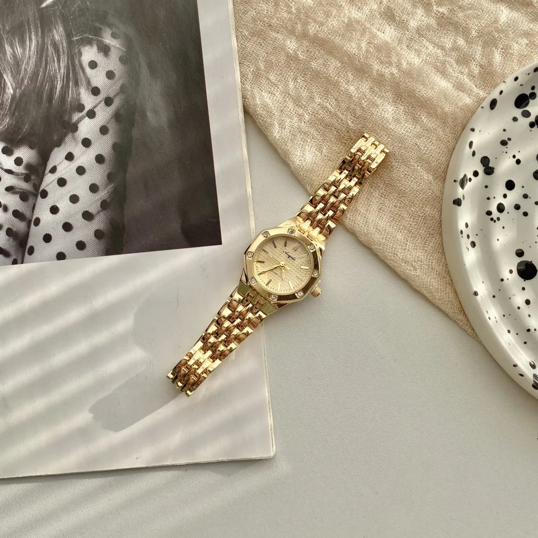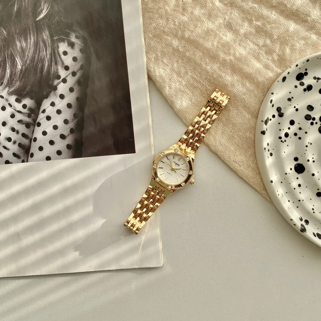 ساعة يد نسائية فاخرة بتصميم دائري، سوار من الفولاذ الذهبي، تعمل بالكوارتز، ساعة يد ذهبية أنيقة للنساء.