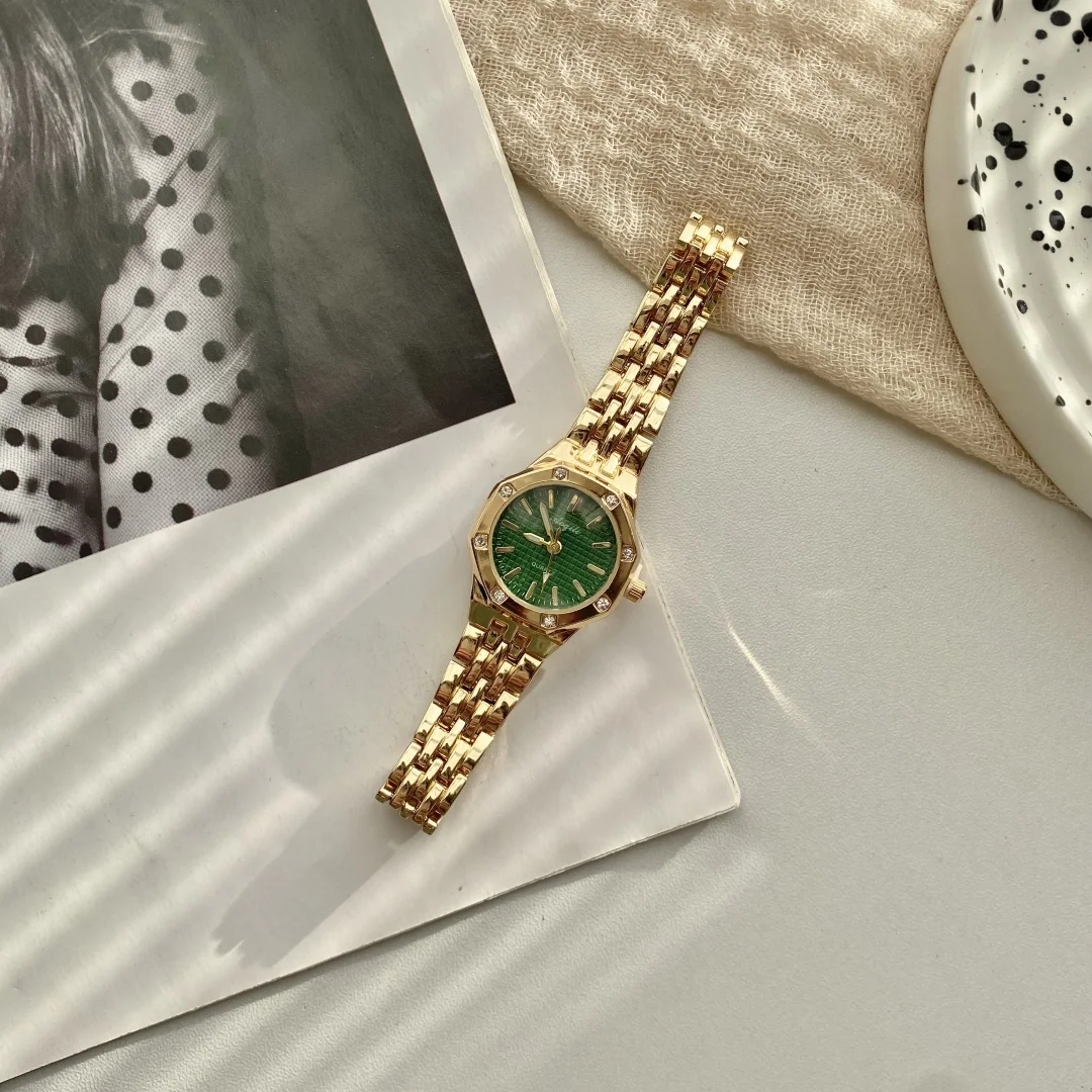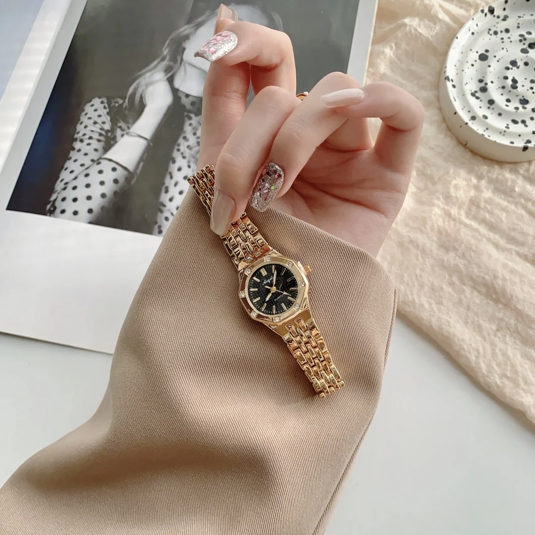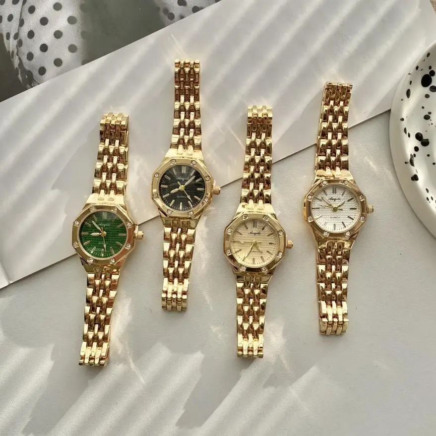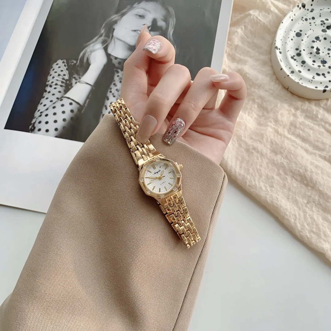 ساعة يد نسائية فاخرة بتصميم دائري، سوار من الفولاذ الذهبي، تعمل بالكوارتز، ساعة يد ذهبية أنيقة للنساء.