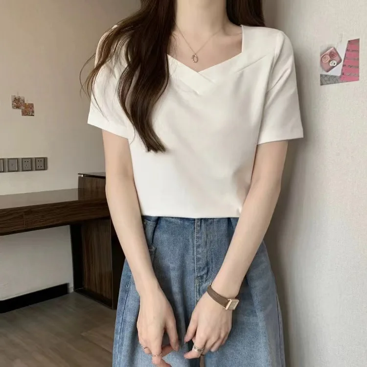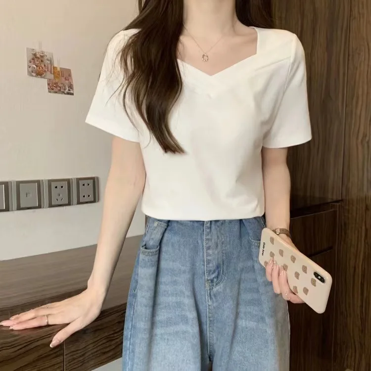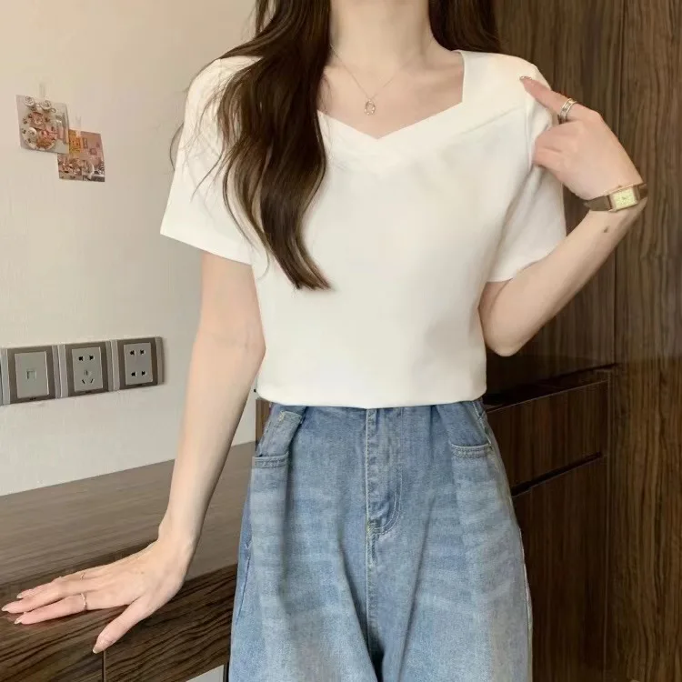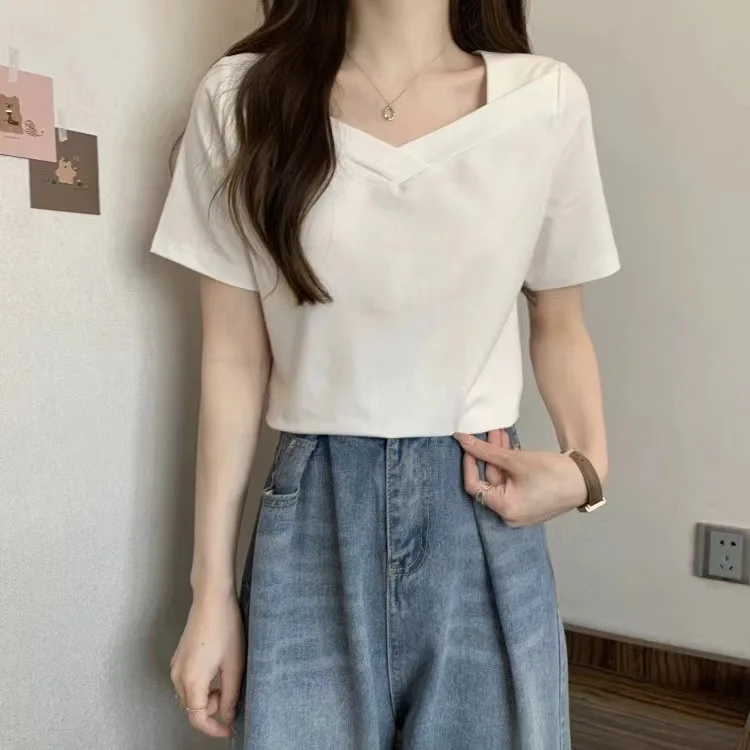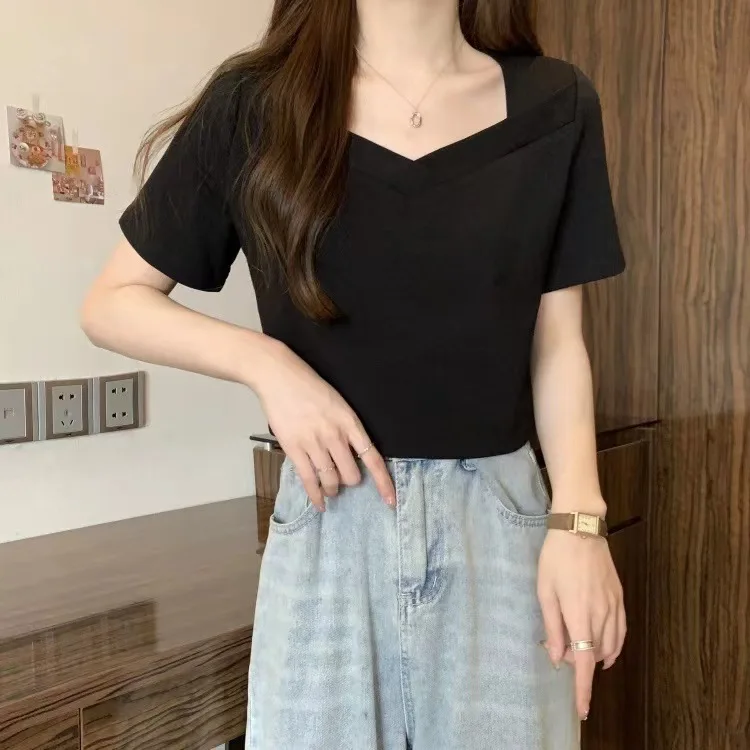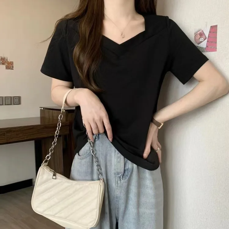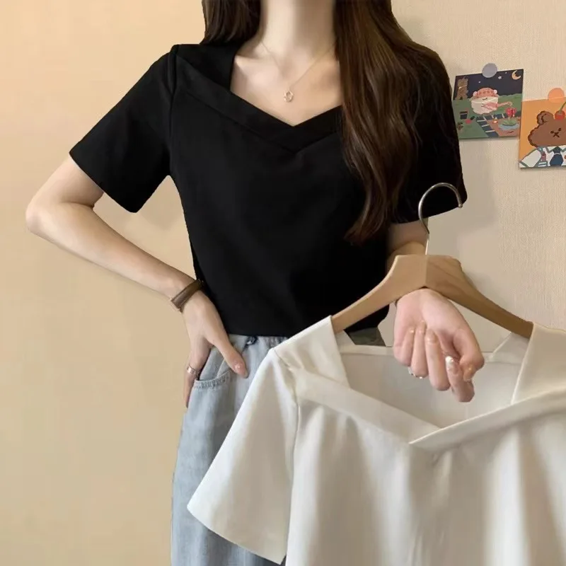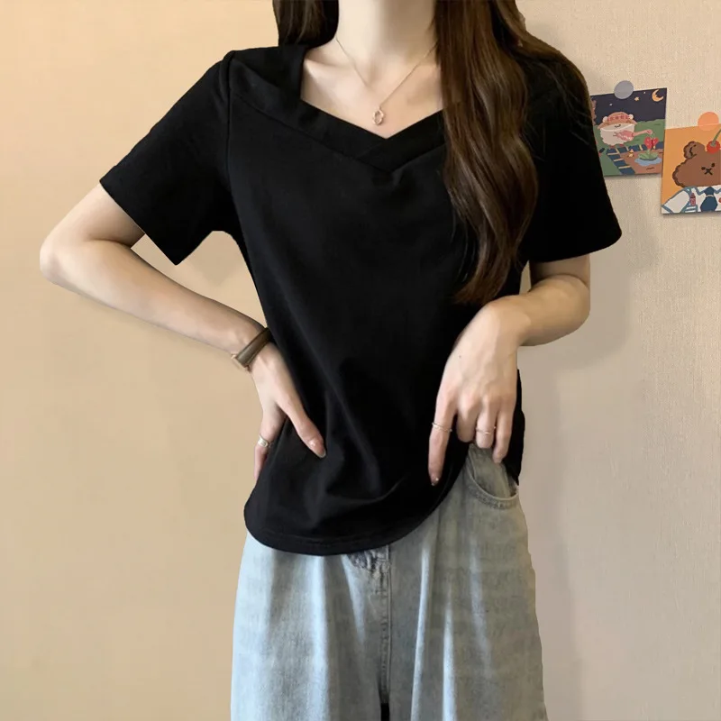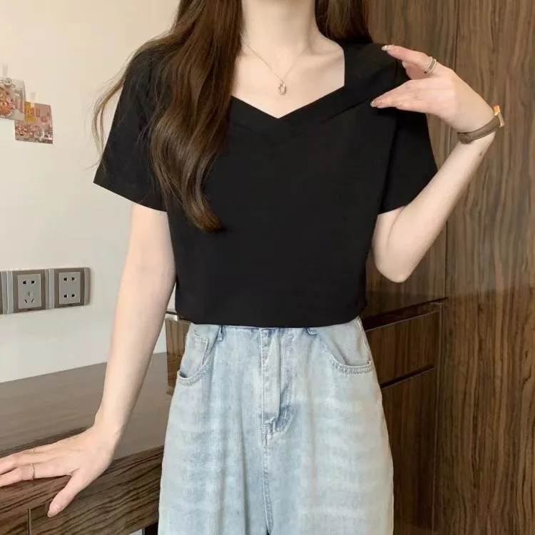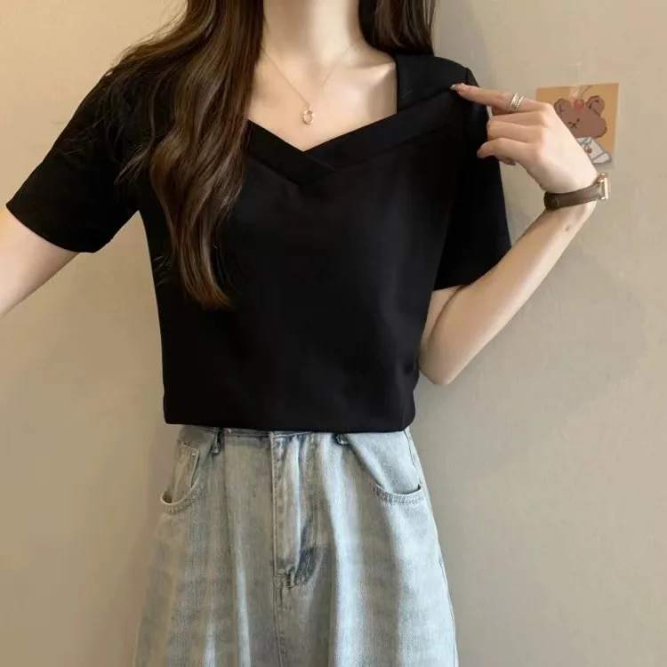 V-neck Loose Casual T-shirt Women Slim Kpop Y2K Tee Shirt Femme Sexy Vintage Summer Tshirts Woman Black Casual Clothes Tops