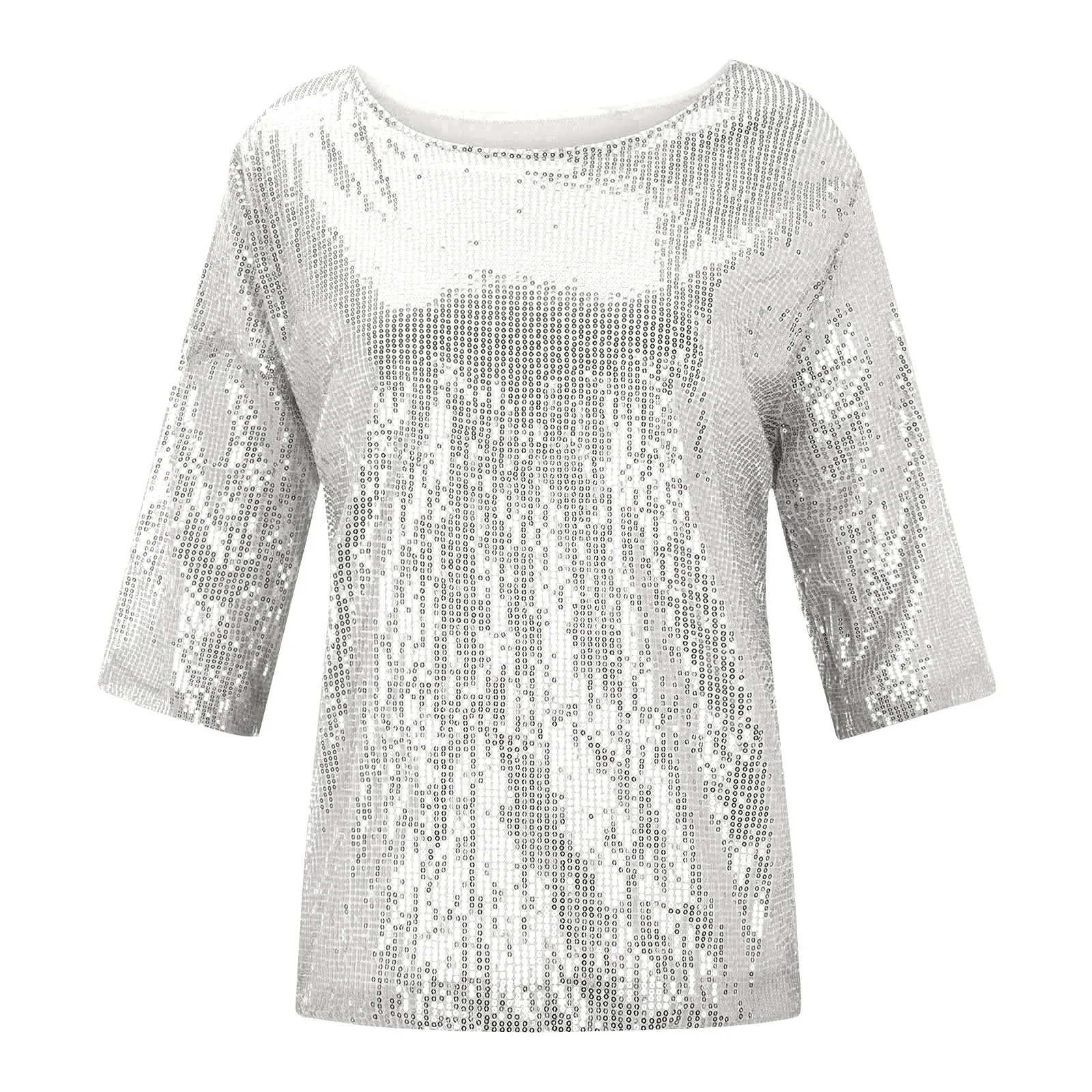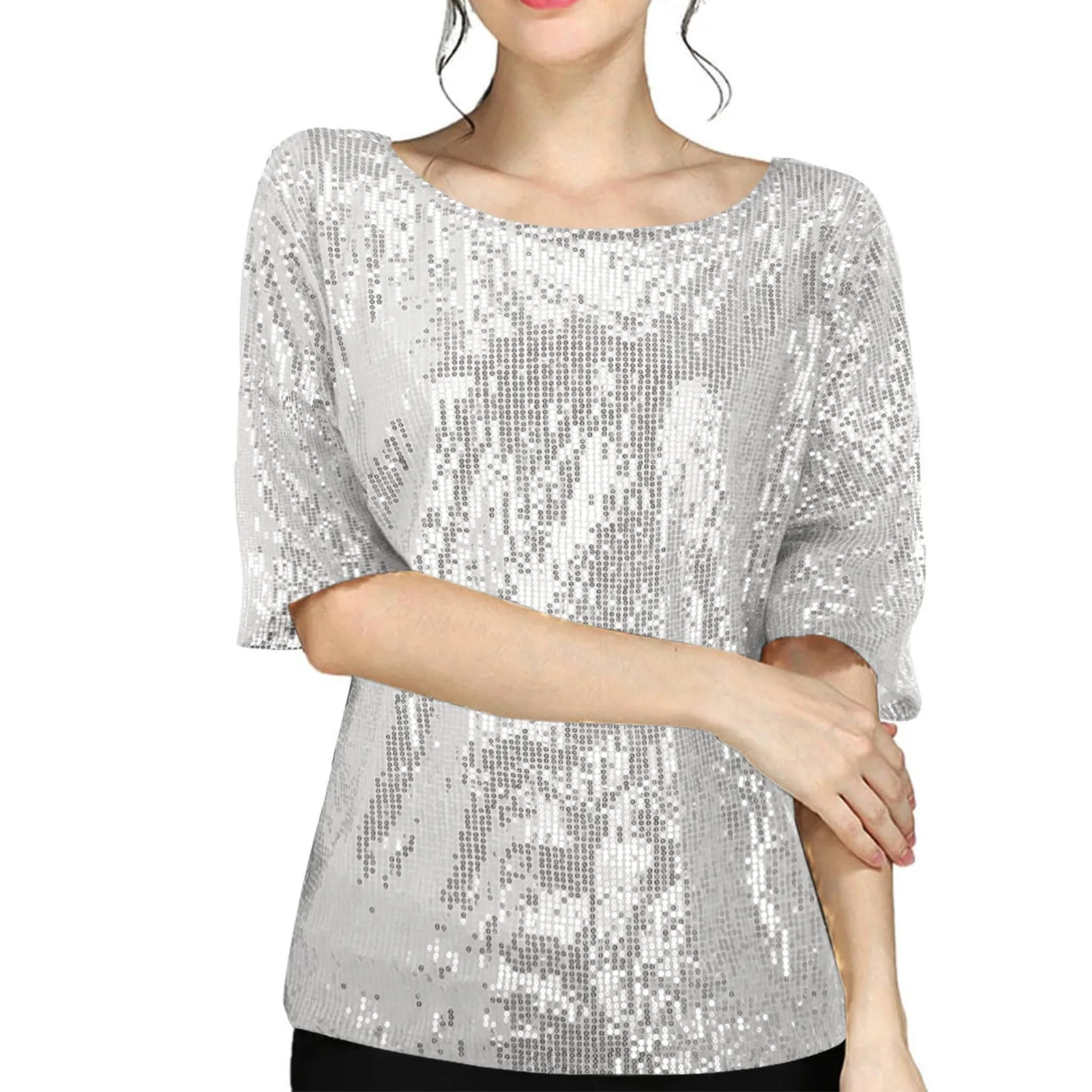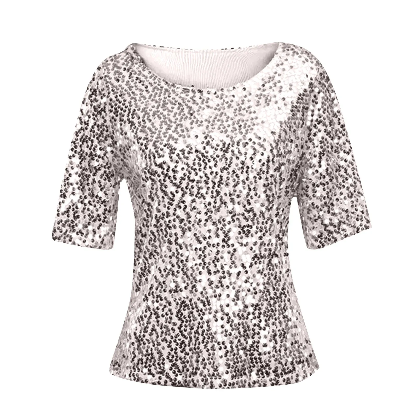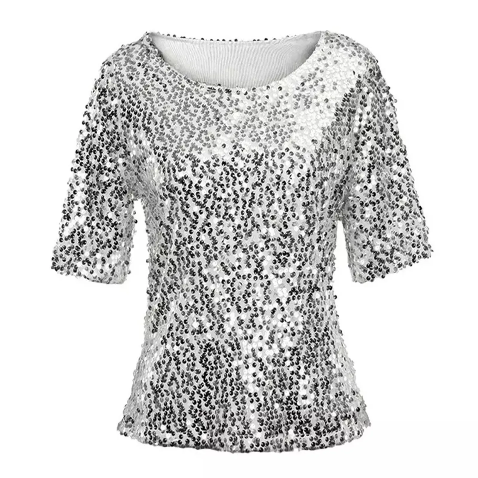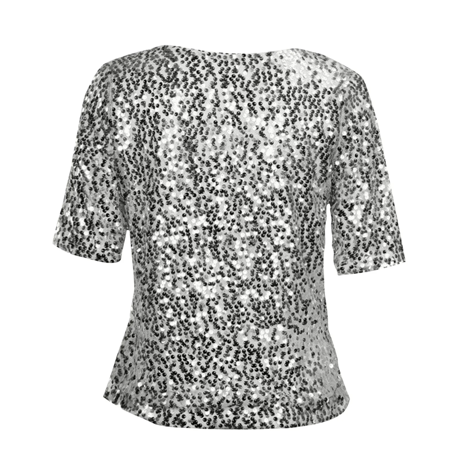 Women's Solid Color Sequined Round Neck Loose Casual Short Sleeve T-Shirt Top