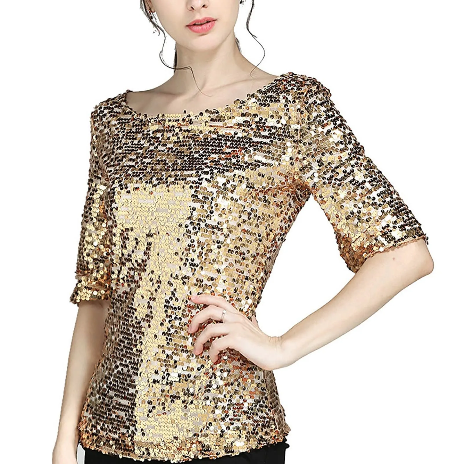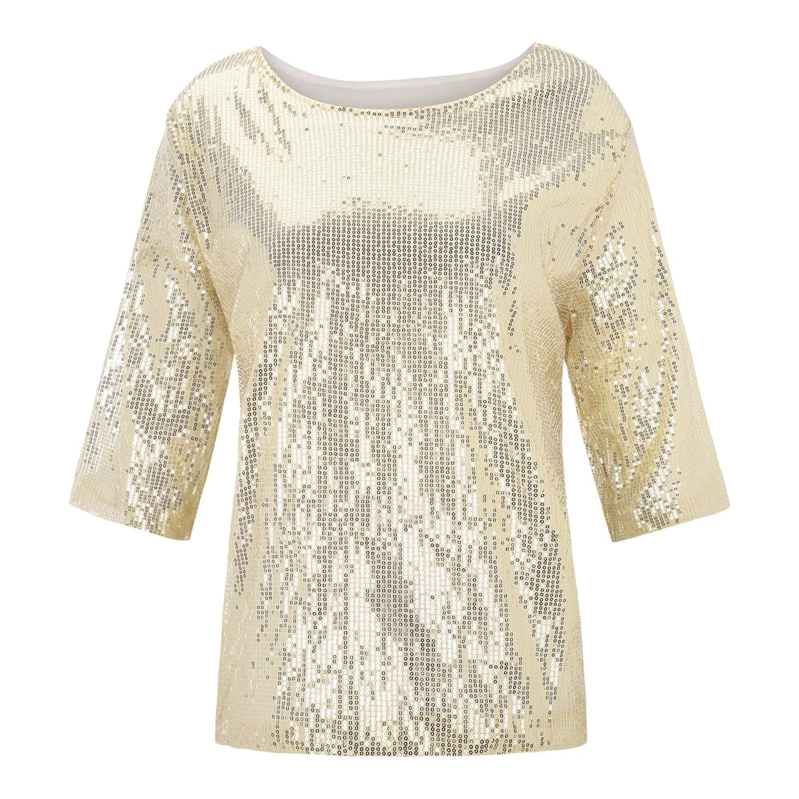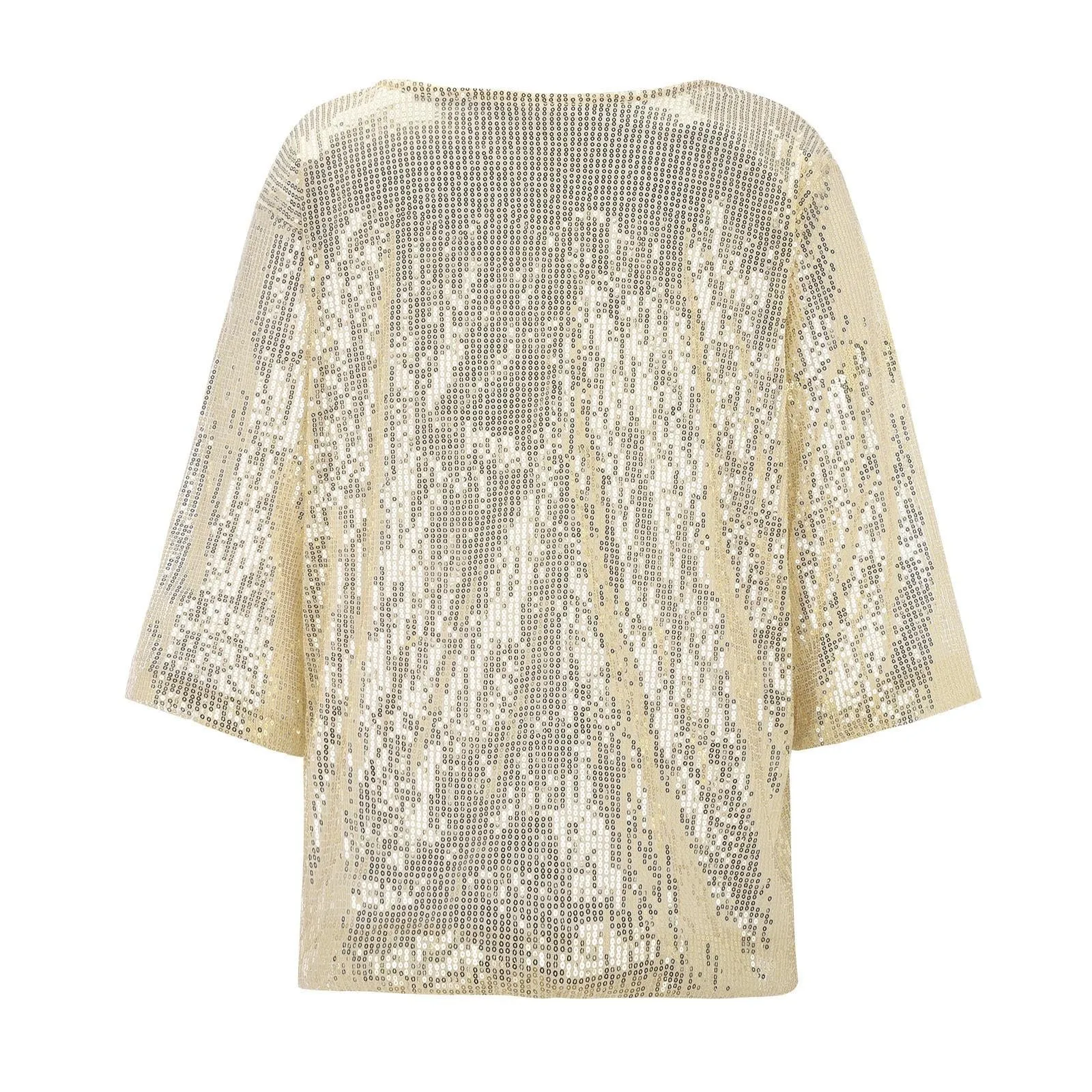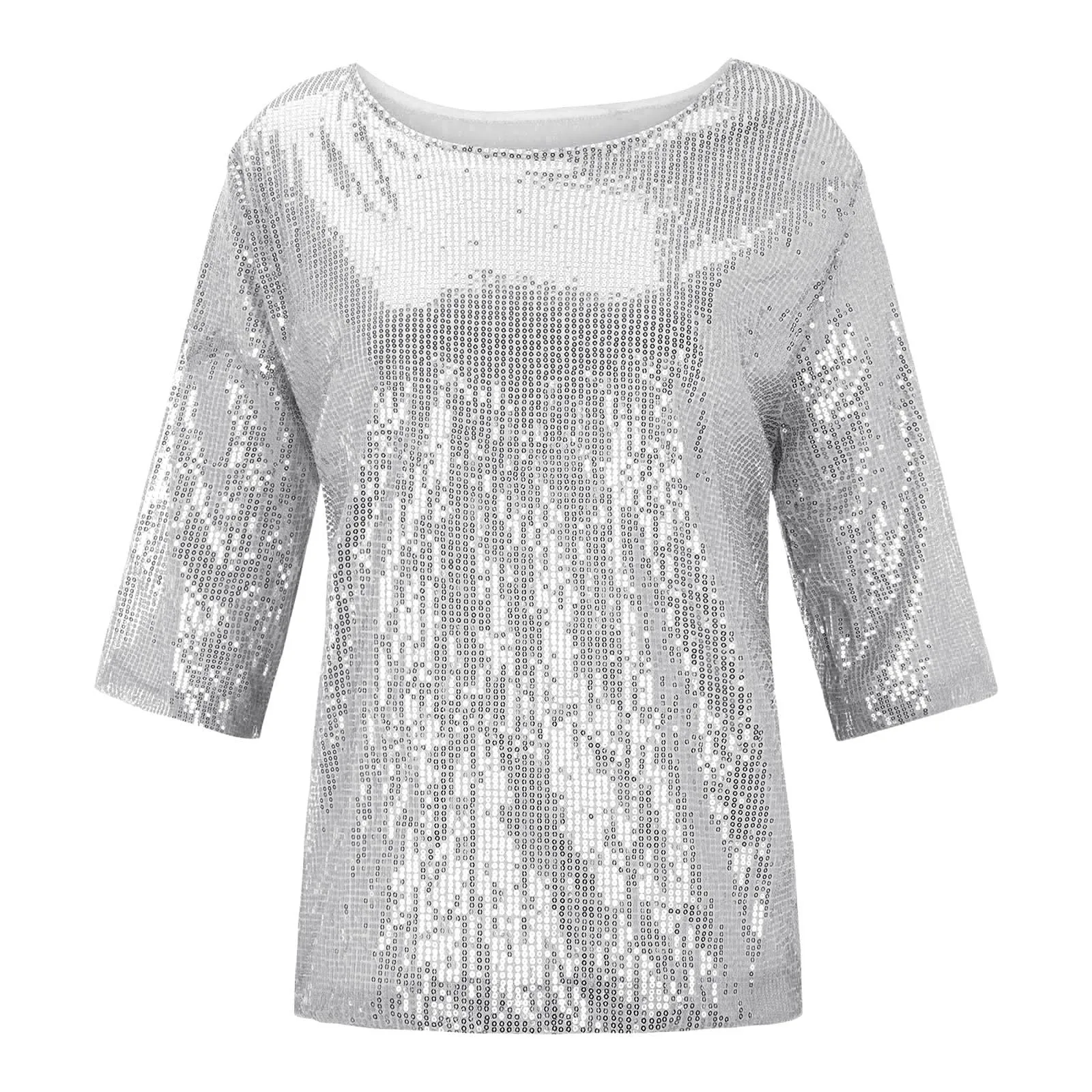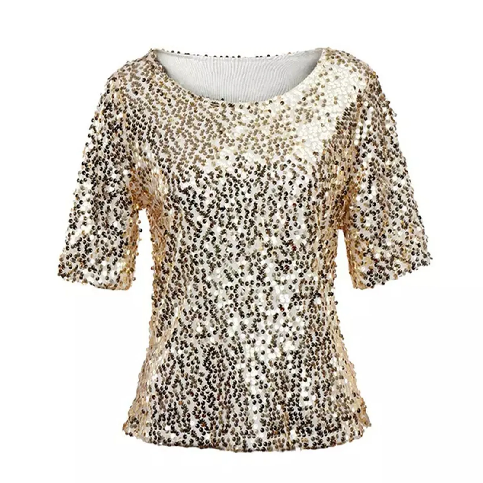 Women's Solid Color Sequined Round Neck Loose Casual Short Sleeve T-Shirt Top